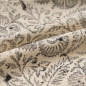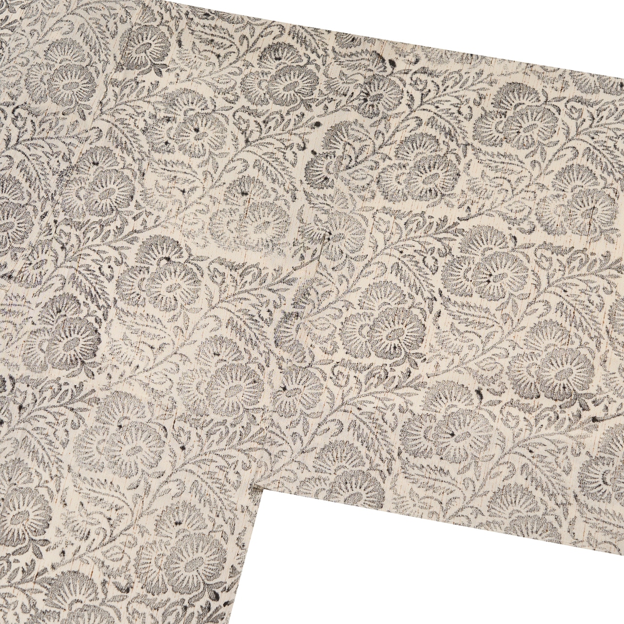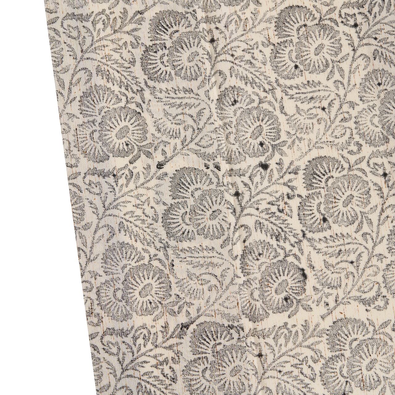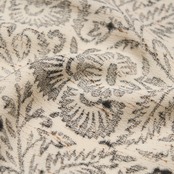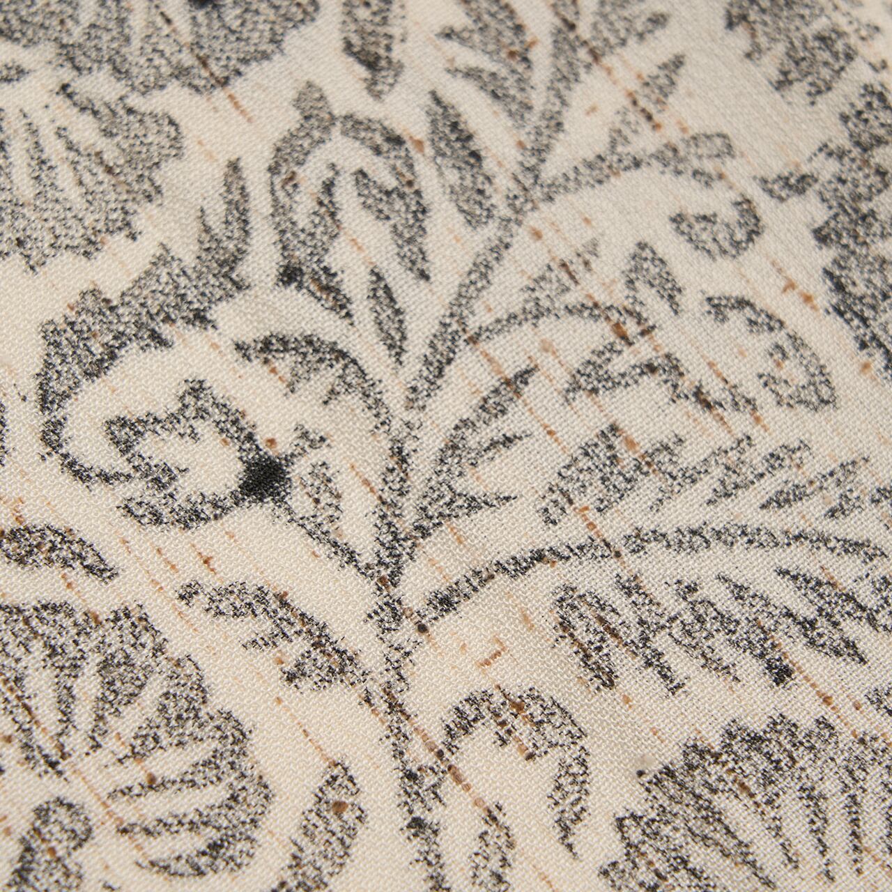 経糸にぜんまいの綿を紡いで織り込まれた、小千谷の紬ちりめんのような手触りの良い象牙色の生地に、中型の大きさの花唐草の模様が、鈍色から藍墨茶色への濃淡で全体にびっしりと木版で染められた、小紋の柄付けの素晴らしい川端美朝さんの作品です。