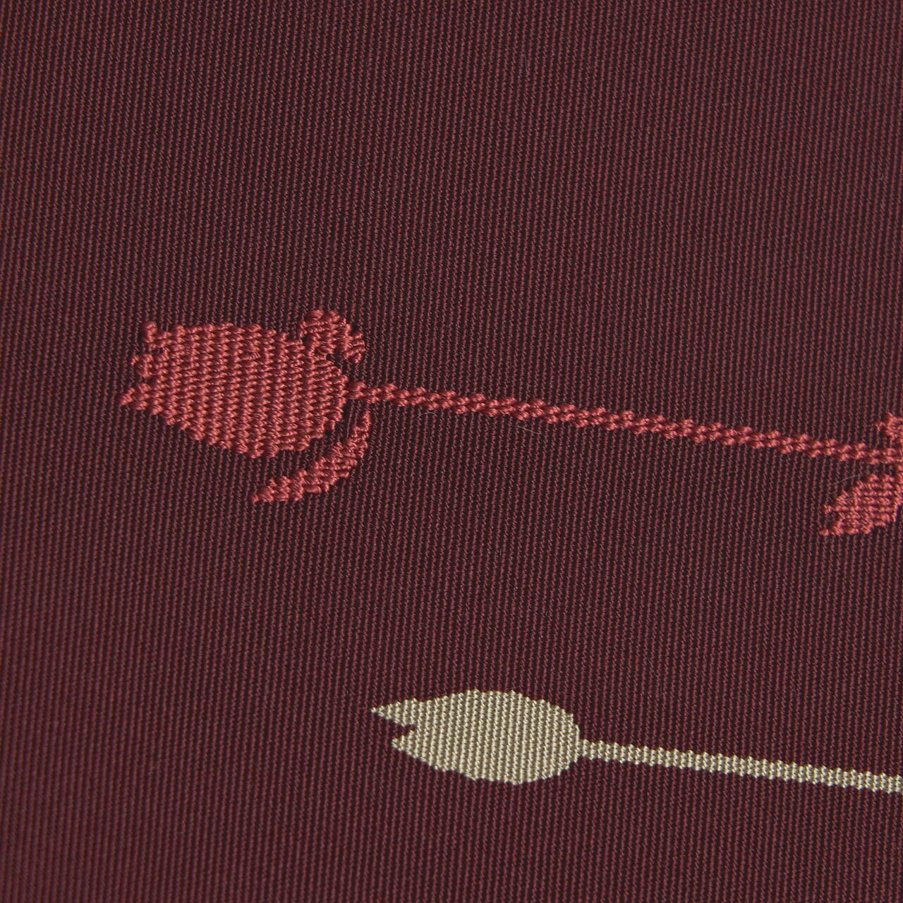 深いボルドー・葡萄色の地に、お太鼓の右側から、小さな蕾のついたいろいろな色の薔薇の枝が並べられたような可愛らしい模様が、少しディフォルメされたデザインで爪掻きの綴れ織で表された、川島織物さんの素敵な八寸名古屋帯です。