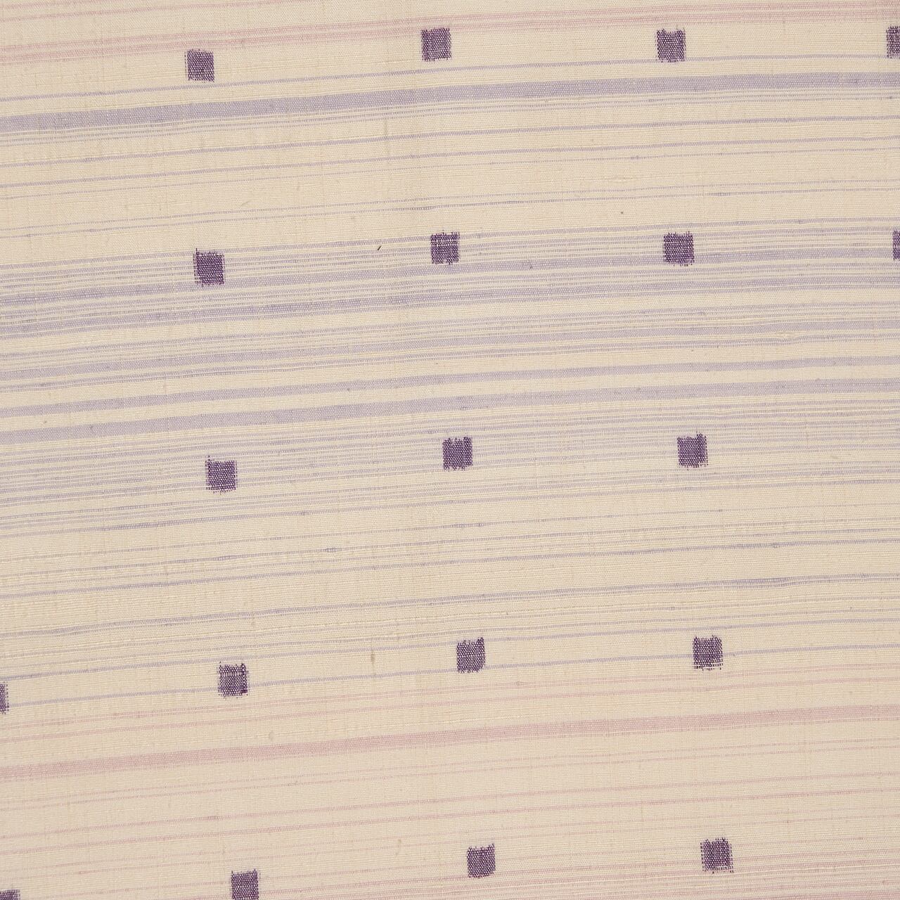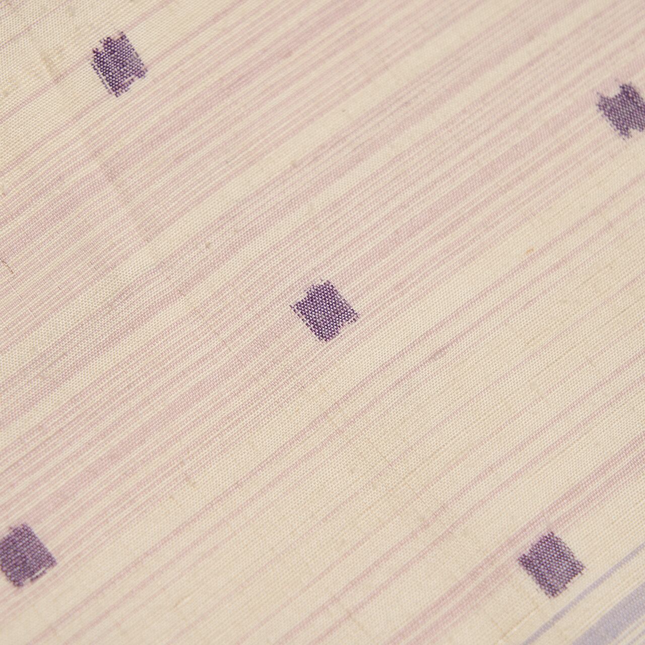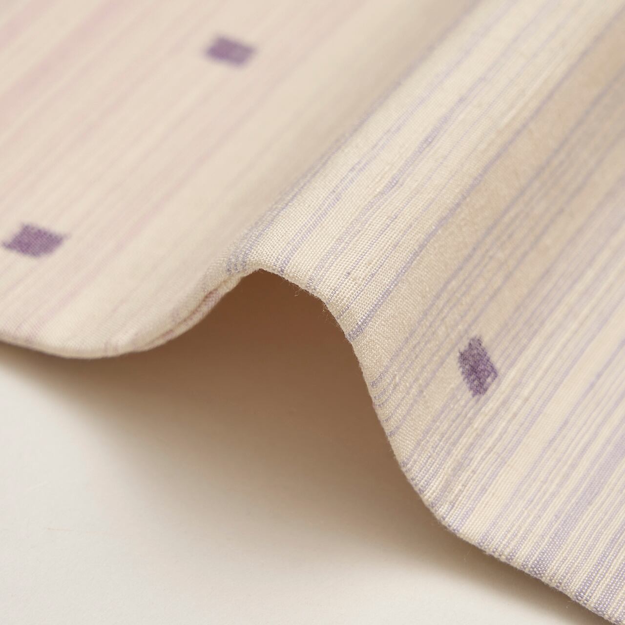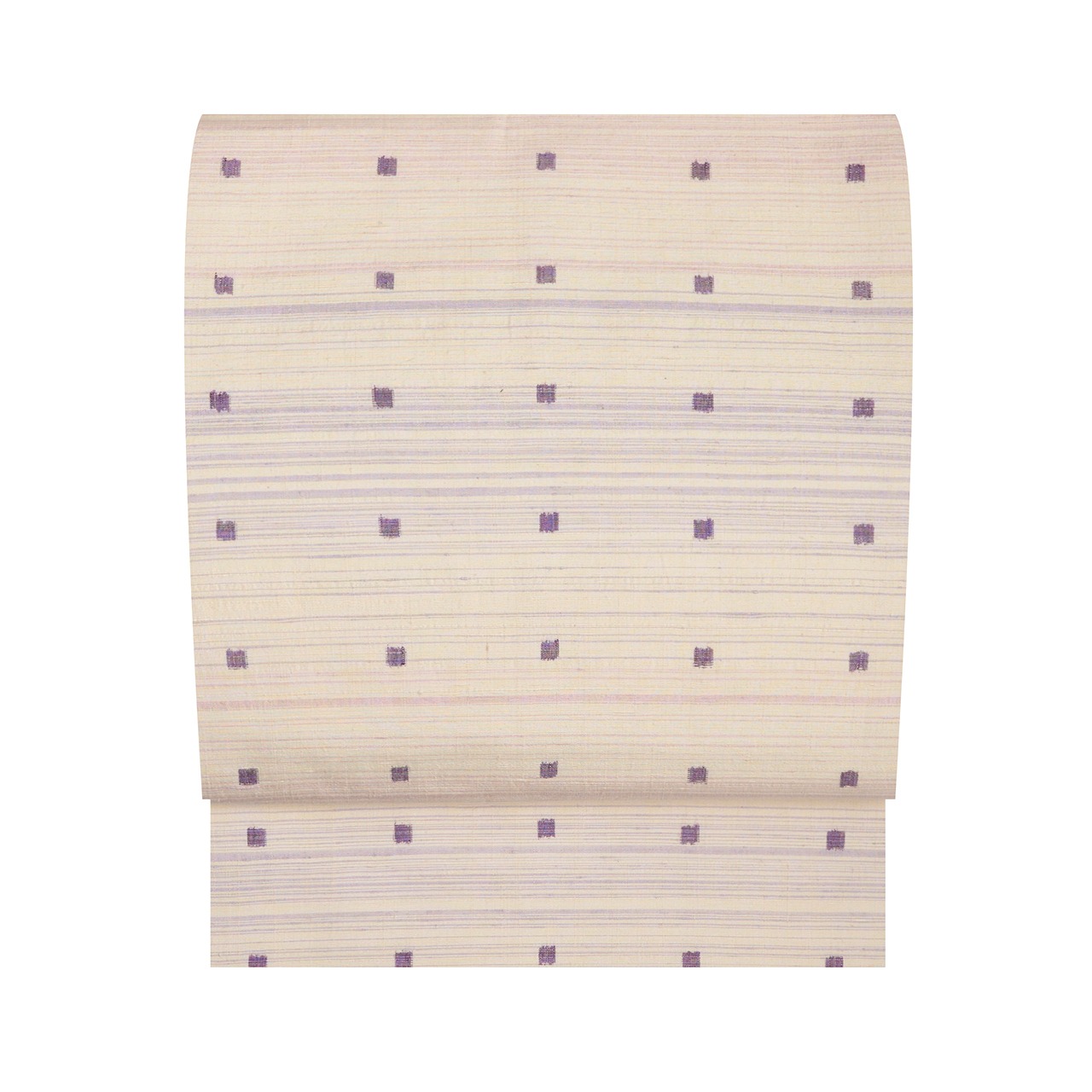 真綿紬のふっくらとした象牙色の地に、青味のある紫・藤鼠色と、淡い紫寄りのピンク・浅紫色の細い縞が密度を変えながら段になったように織り出され、約1cm角の小さな四角が淡い紫・濃鼠色の絣糸で全通で織り出された、とても爽やかな印象の九寸名古屋帯です。