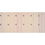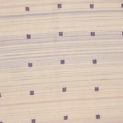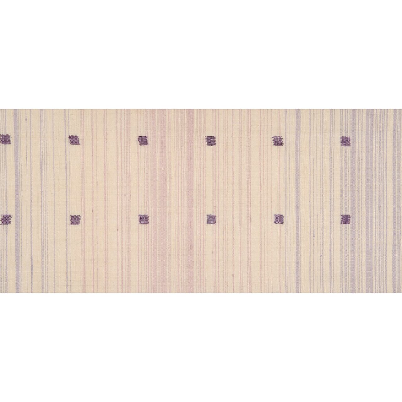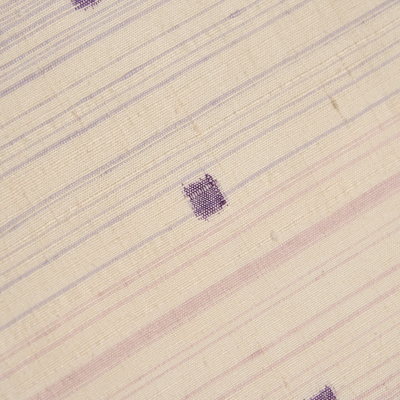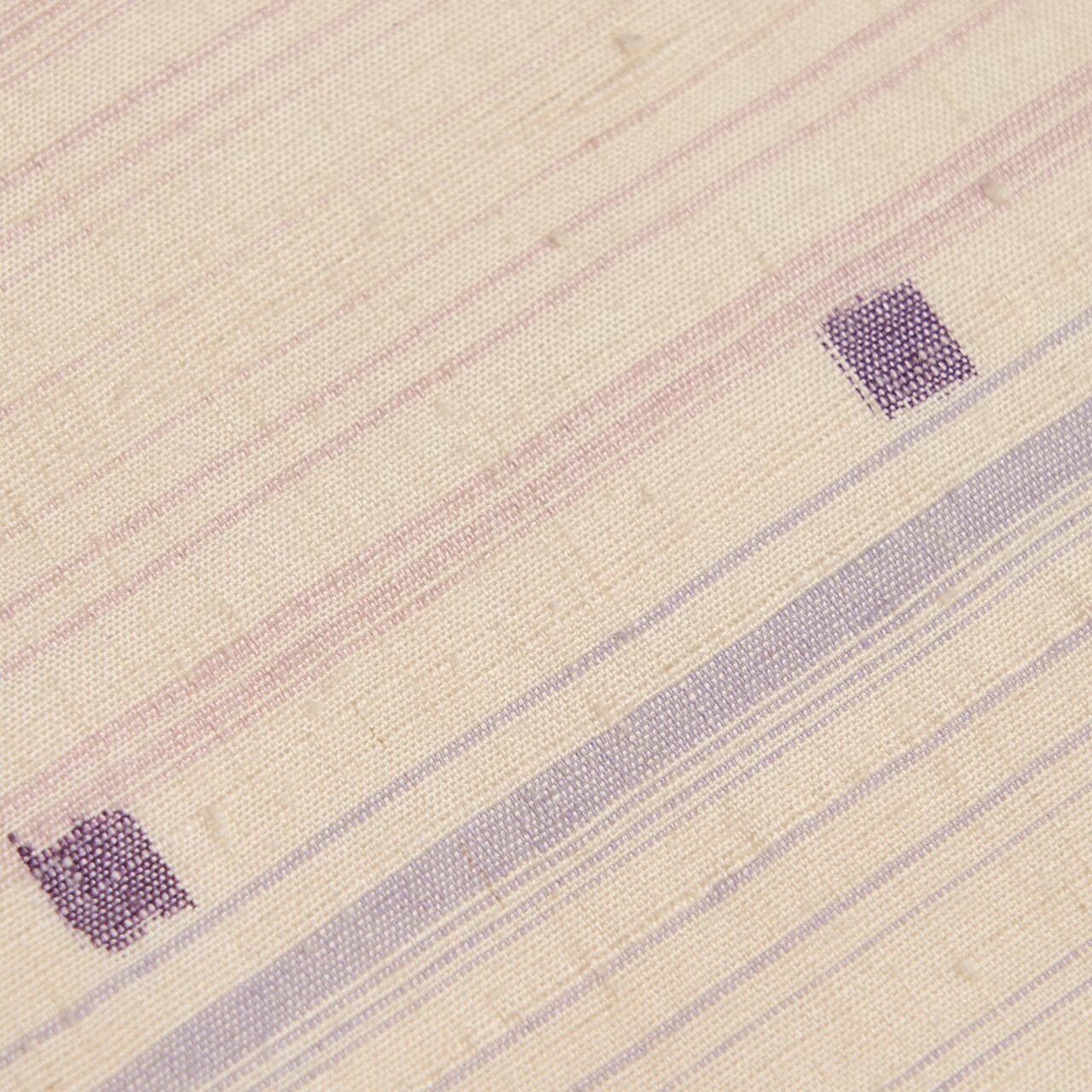 真綿紬のふっくらとした象牙色の地に、青味のある紫・藤鼠色と、淡い紫寄りのピンク・浅紫色の細い縞が密度を変えながら段になったように織り出され、約1cm角の小さな四角が淡い紫・濃鼠色の絣糸で全通で織り出された、とても爽やかな印象の九寸名古屋帯です。