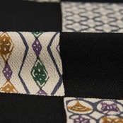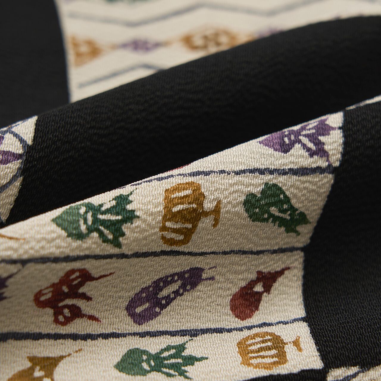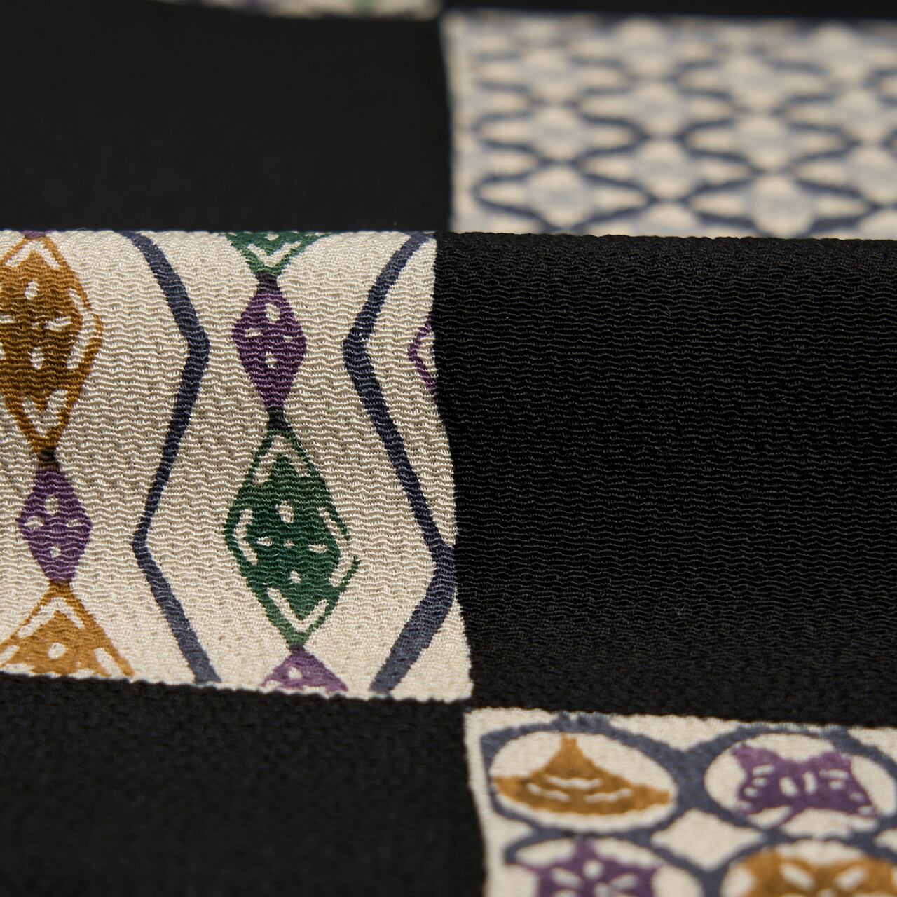 少しシボのある生成り色のちりめんの生地が、約7×9cmの大きさの四角の市松取に黒で染められ、白地の部分によろけ縞に梅の花、七宝繋ぎのような模様、縞に野菜の模様、ジグザグの縞に菱の模様など、いろいろな模様が型染めで染められた、お洒落な小紋のお着物です。