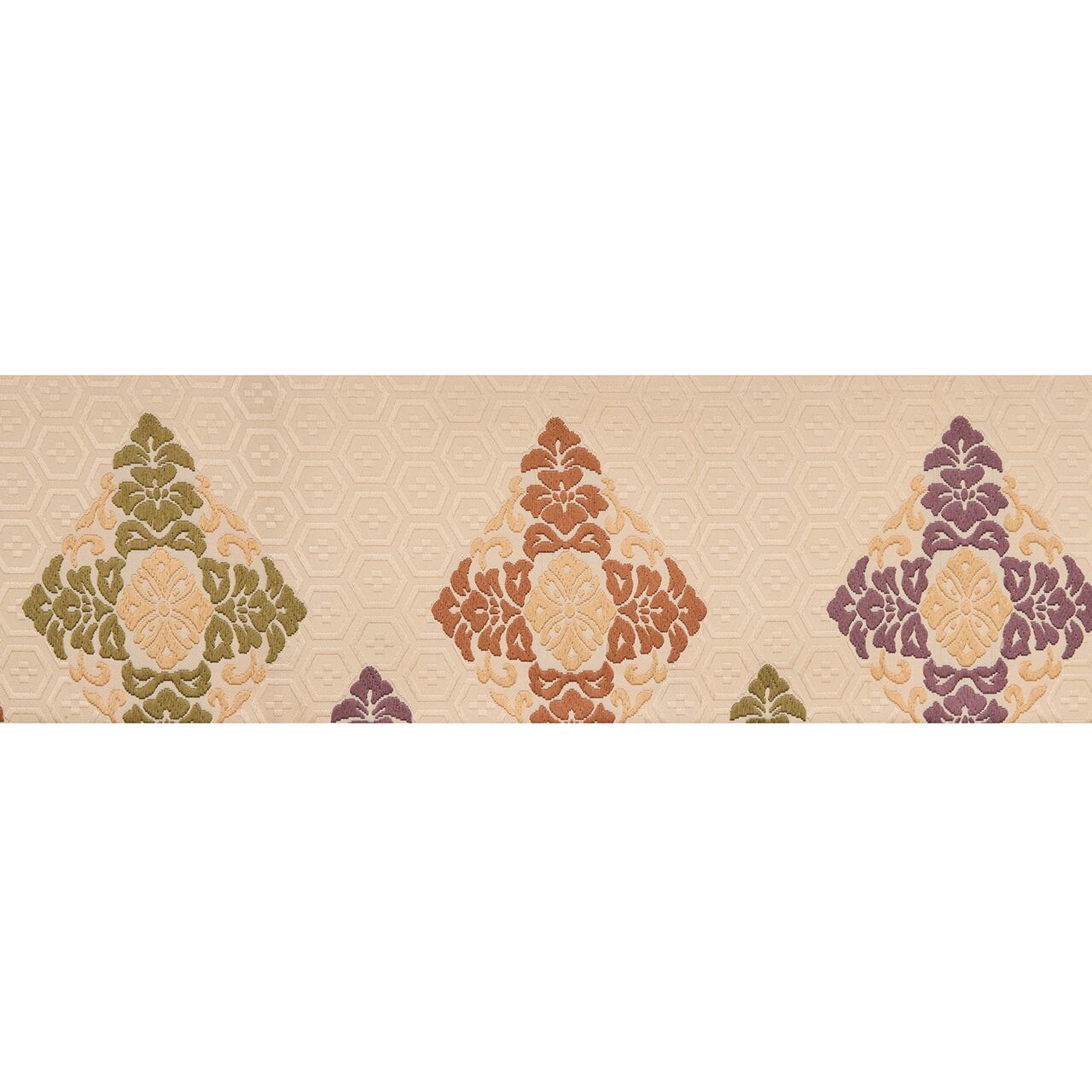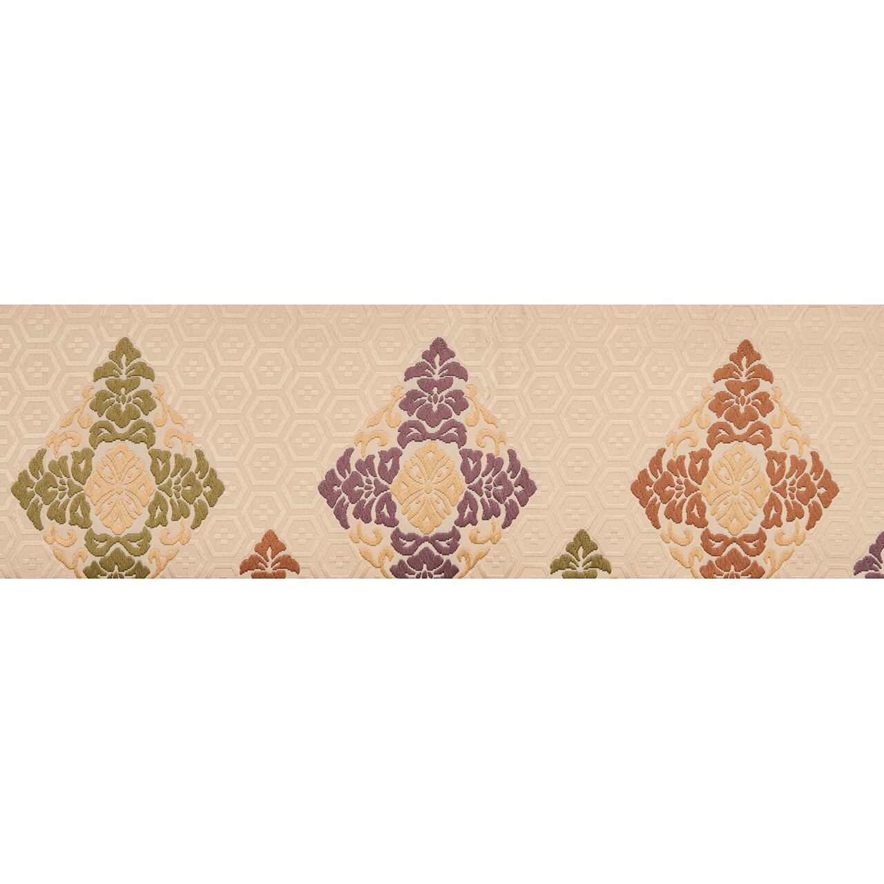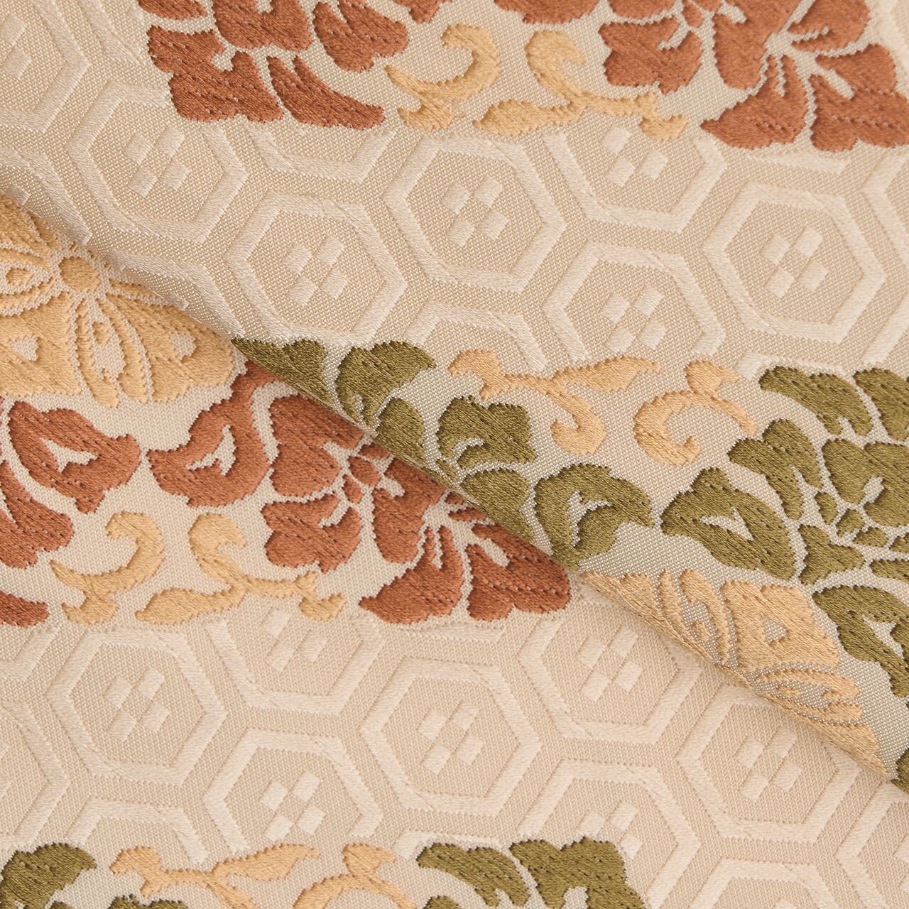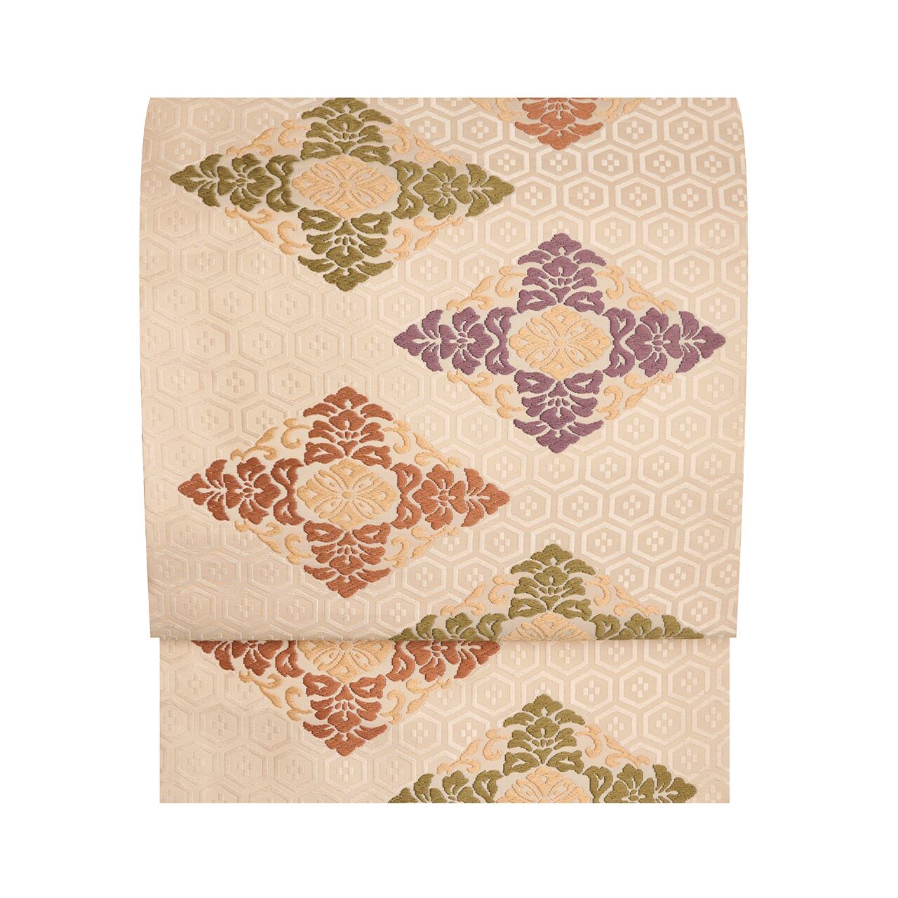 象牙色地に同色で亀甲の中にお花が入れられたような地模様が織られ、そこにやや大きめの花を携えた菱の模様が、赤白橡のピンクベージュや、赭色のオレンジ味のある茶色、深紫色、草色などの糸で、華やかに織り出されています。