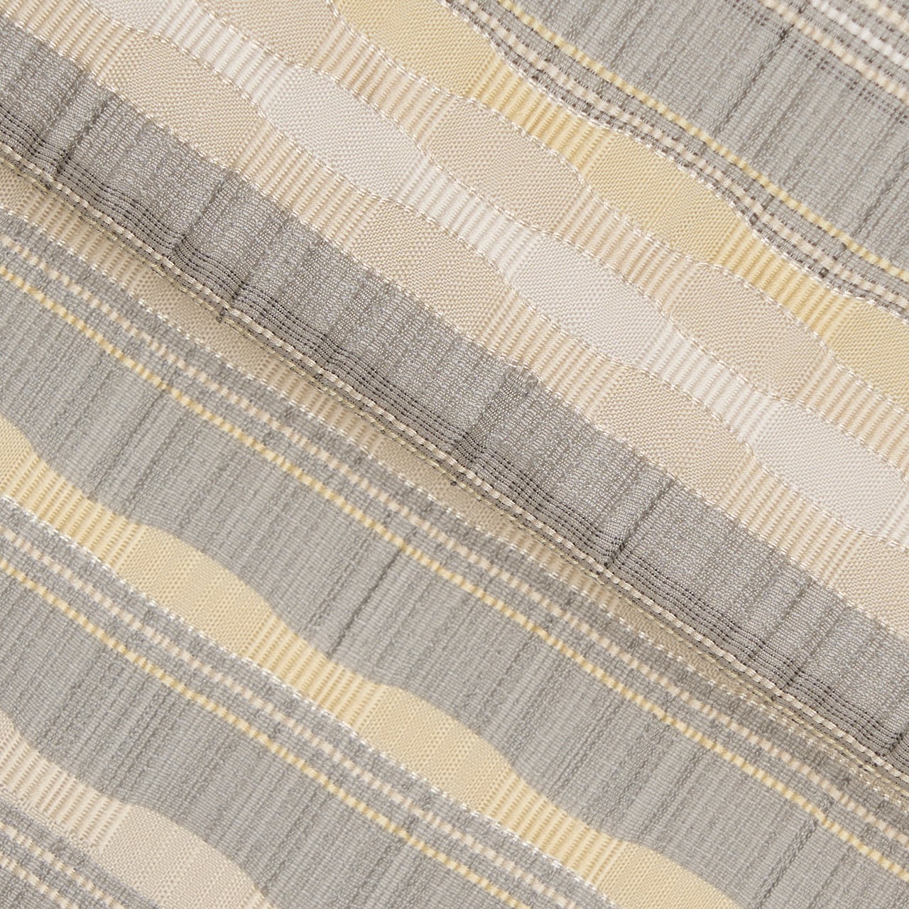 淡いグレー・錫色の糸が変り織にされて、変化のある光沢のある地に、蒸栗色の細い横縞が3本、2本とランダムに入れられた段と、その間に蒸栗色と生成り色といったとても淡い色糸でめがね織が織り出された段があり、それらが全通で織られ、お太鼓にはさらに白橡色が加わって、段の幅も大きく小さくいろいろに取られた、淡色の集合でありながら爽やかなお洒落さのある九寸名古屋帯です。