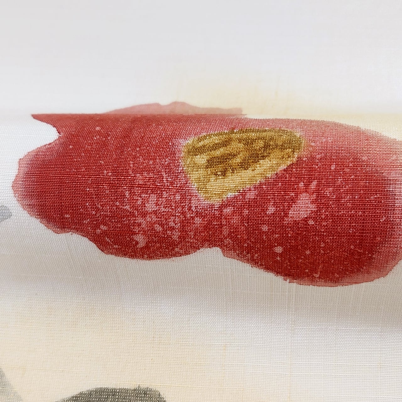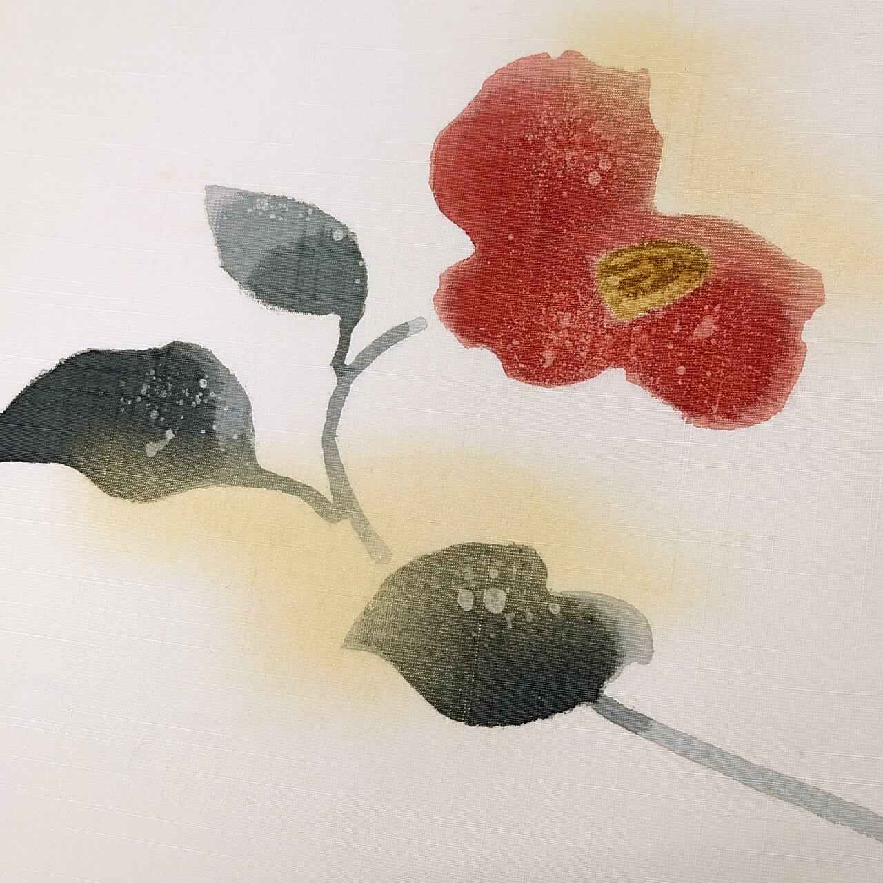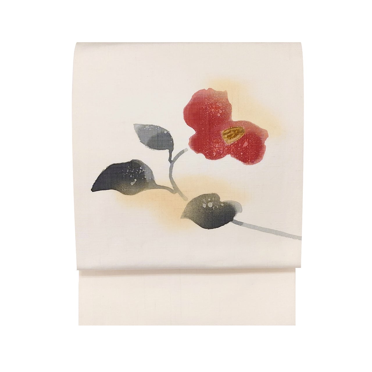少し節の見られる生成り色の紬地に、手描きの蝋纈染でたおやかな椿の花が描かれた九寸名古屋帯です。
