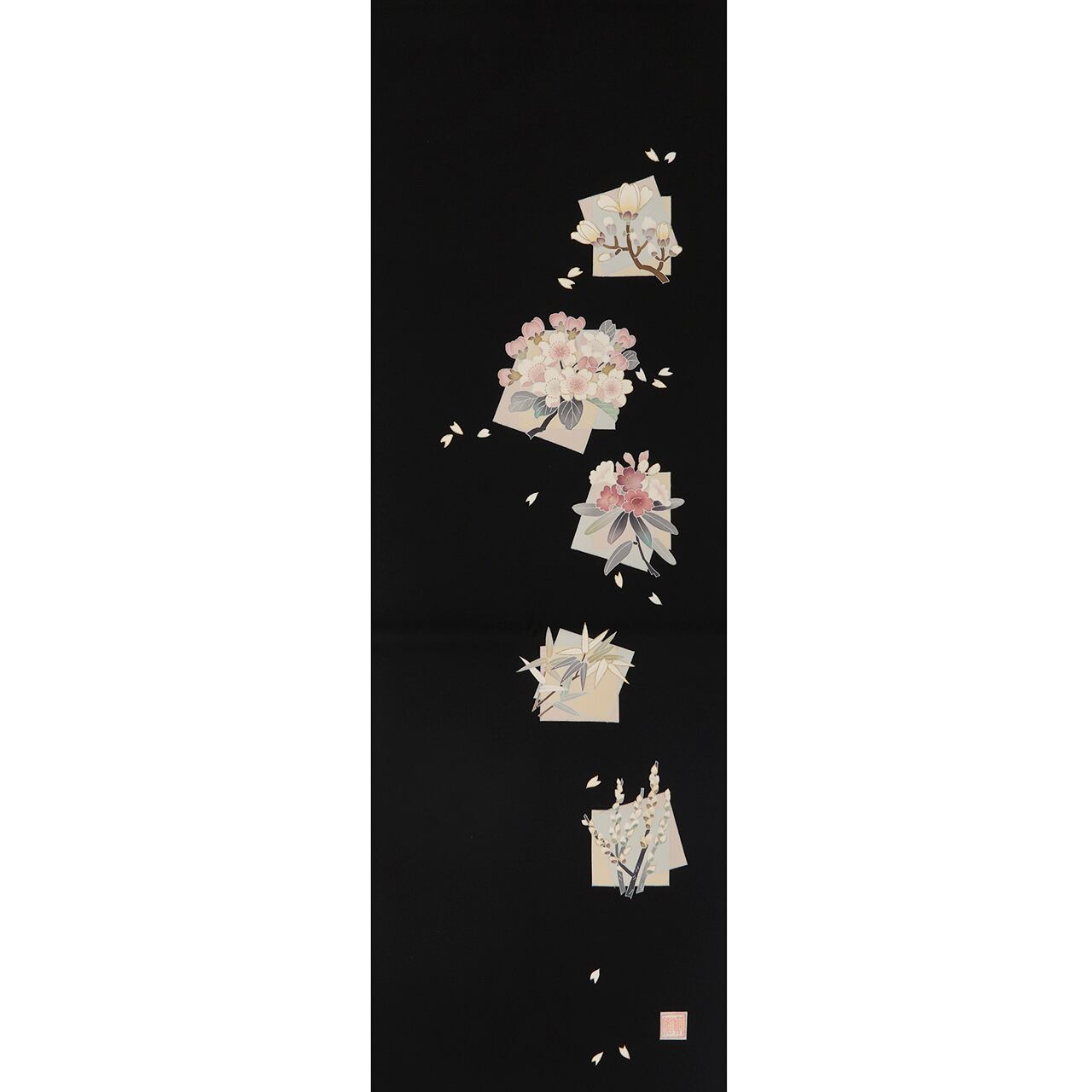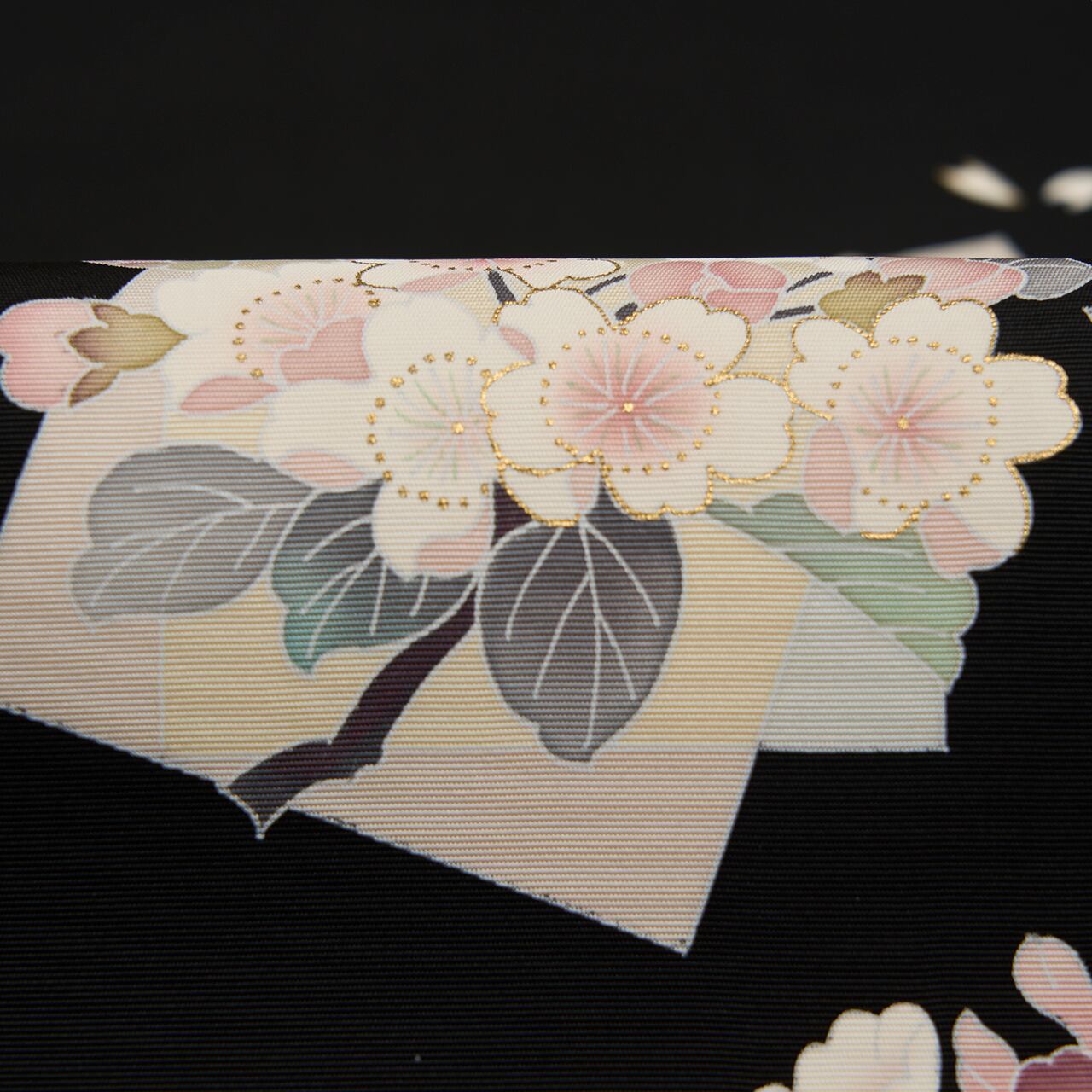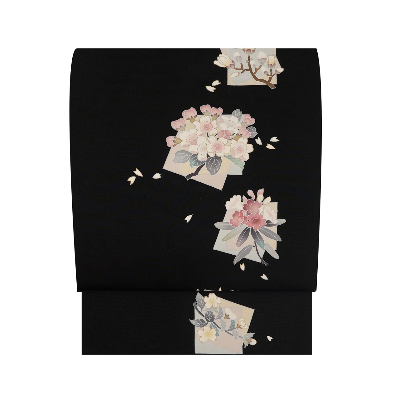 黒い塩瀬の生地に、お太鼓には小さめの色紙取りの模様が取られ、その中に桜や木蓮、石楠花、笹やネコヤナギなどの草花が手描きの東京友禅で描かれた、しっとりとした風情のある素敵な九寸名古屋帯です。