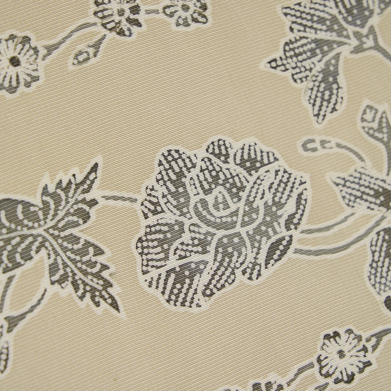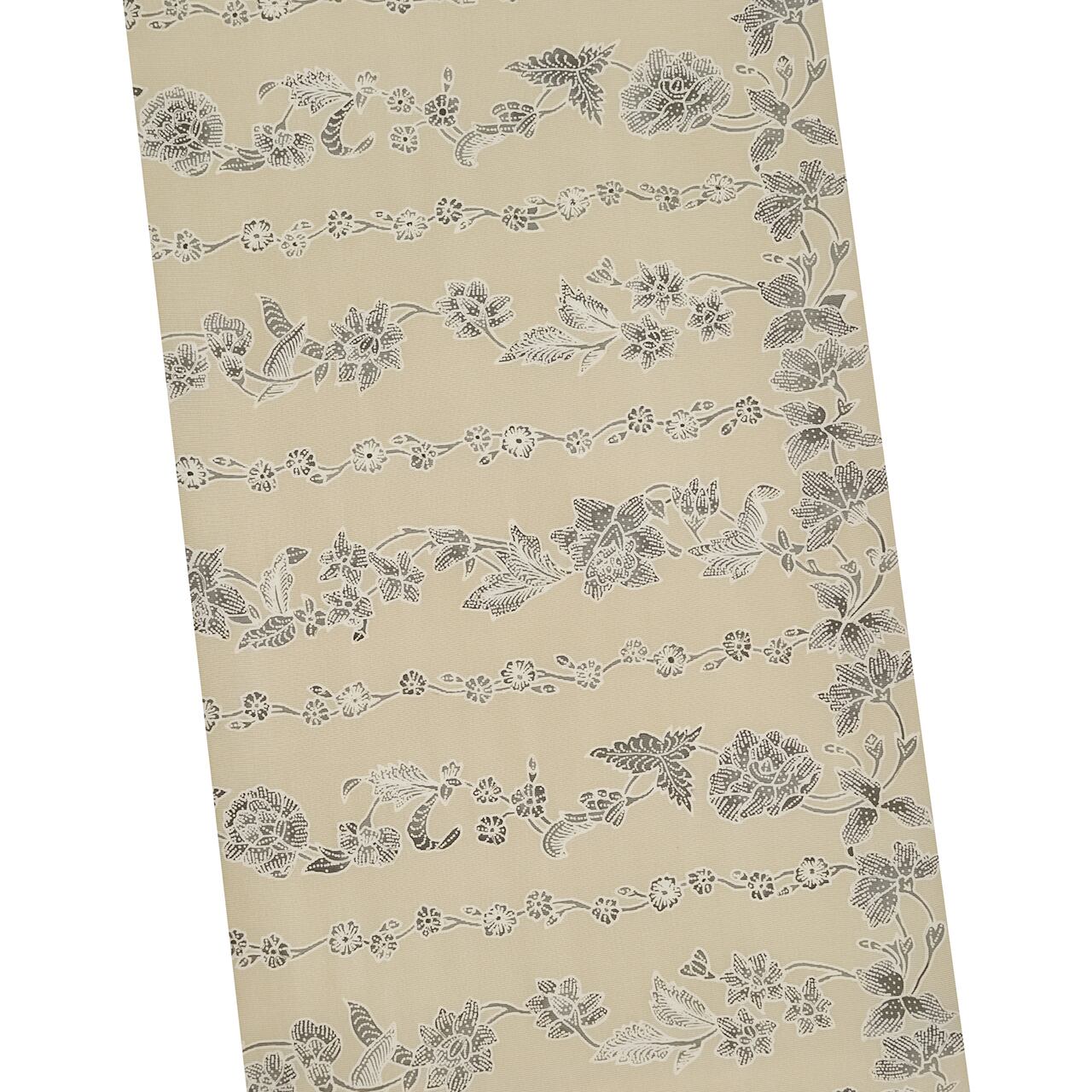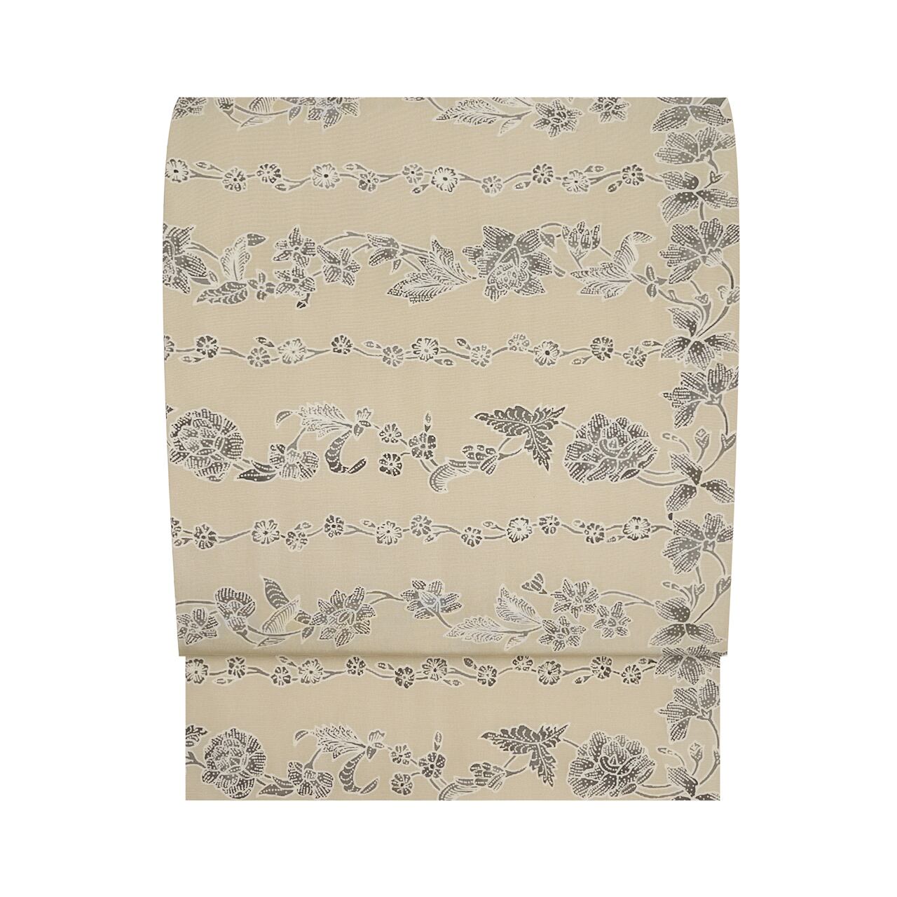ややグレー味のあるベージュ・灰白色の塩瀬の生地に、横に枝を伸ばした蔓にお花が咲いている様子が、段変わりに表情を変えて、手描きの蝋纈染でインドネシアのバティックのような調子に描かれ、藍味のあるグレー・藍墨茶色に染められた、シックな色使いがとてもお洒落な雰囲気の九寸の開名古屋帯です。