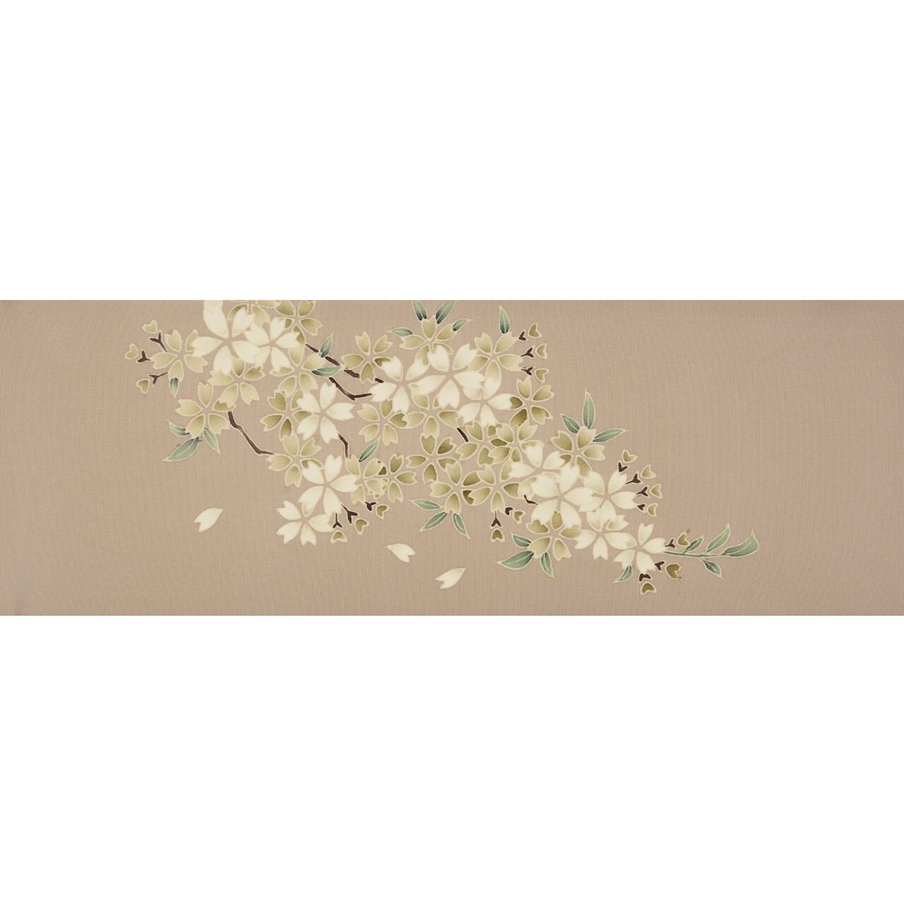少しピンク寄りの甘さのあるベージュ・枯野色の塩瀬の生地に、お太鼓に今を盛りと咲く桜のお花が手描きの友禅で描かれた、素敵な九寸名古屋帯です。
