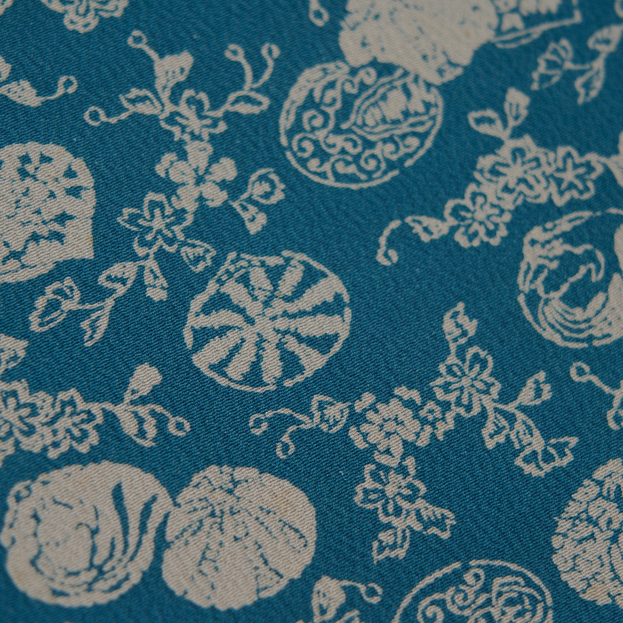 こちらは少しだけグレー味のある明るい藍・紺鼠色の地に、中型の大きさの貝合わせの模様に桜のお花が散らされたデザインですが、貝の中にも様々な模様が施されていたり、桜のお花も何種類かの表現で表されていたりと、非常に細密に描かれています。