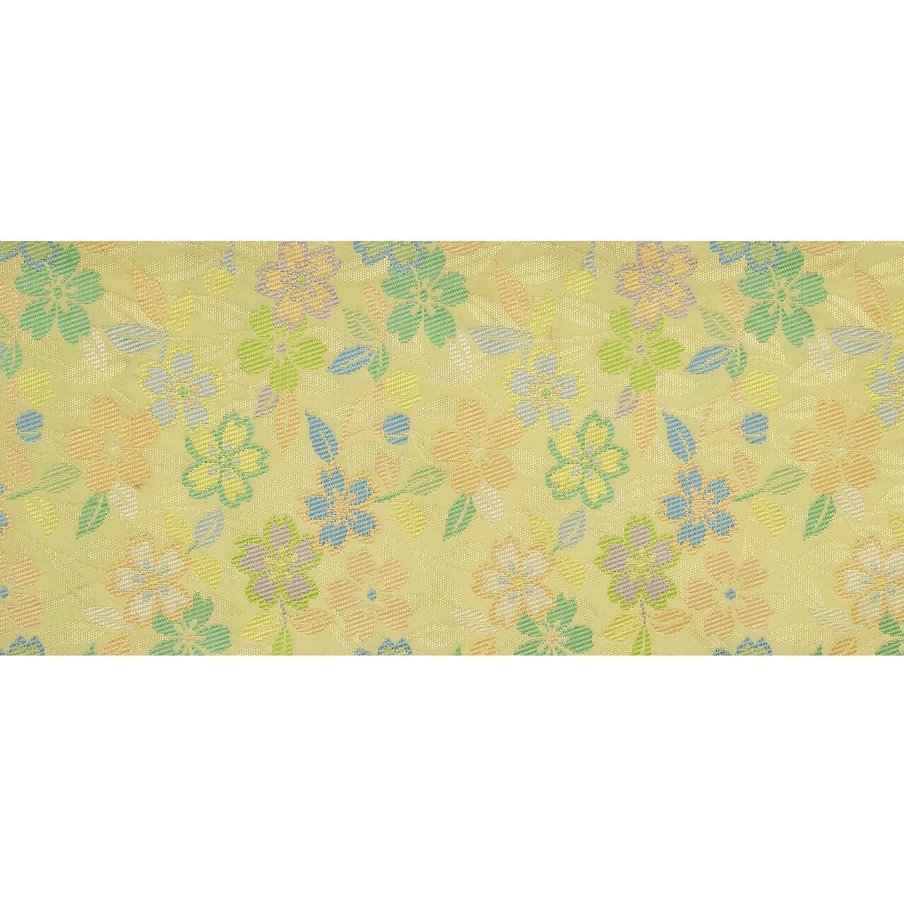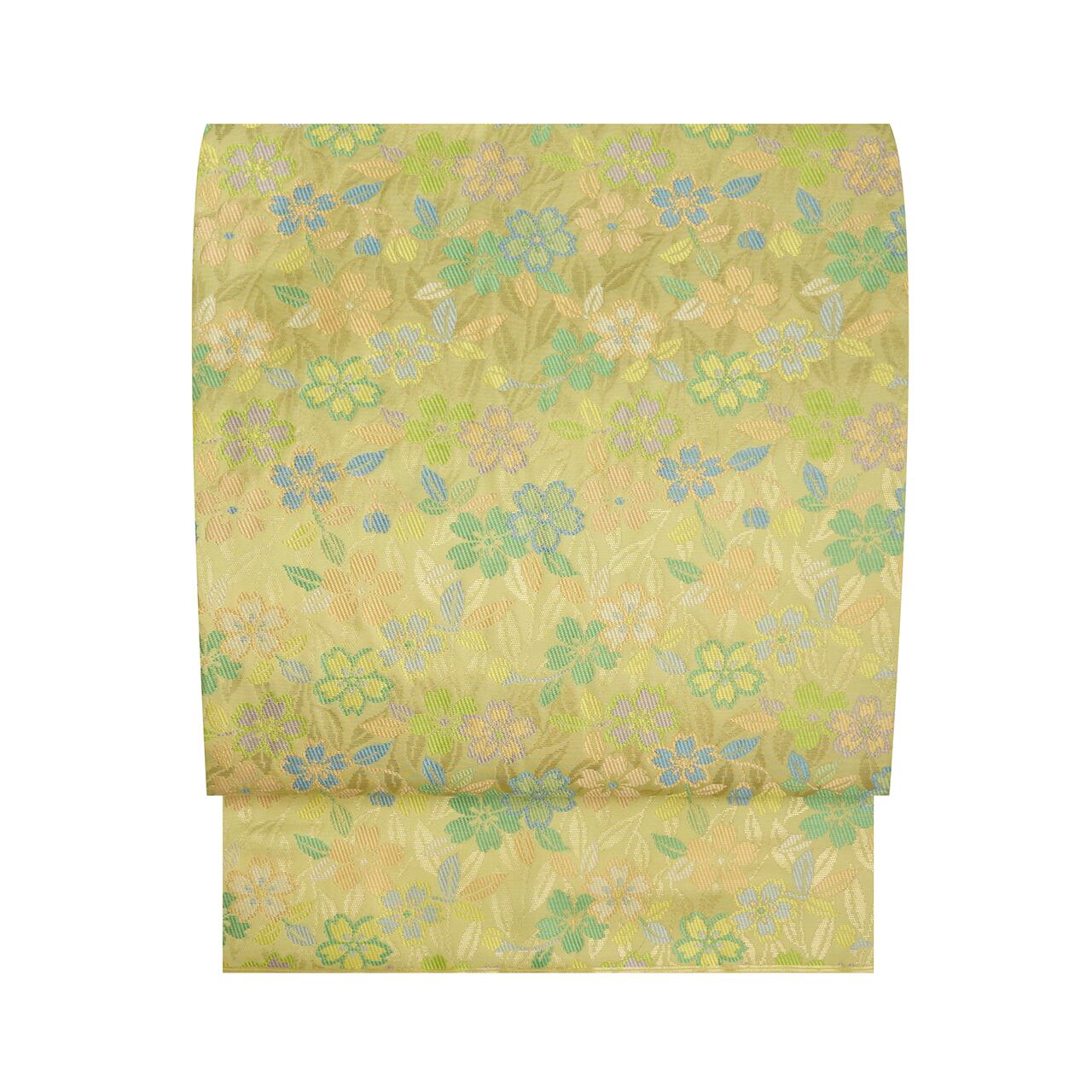 緑味のある黄色・鶸色の地に、色とりどりに咲く桜の花が織り出され、華やかな春の情景が表された、川島織物さんの素敵な九寸名古屋帯です。