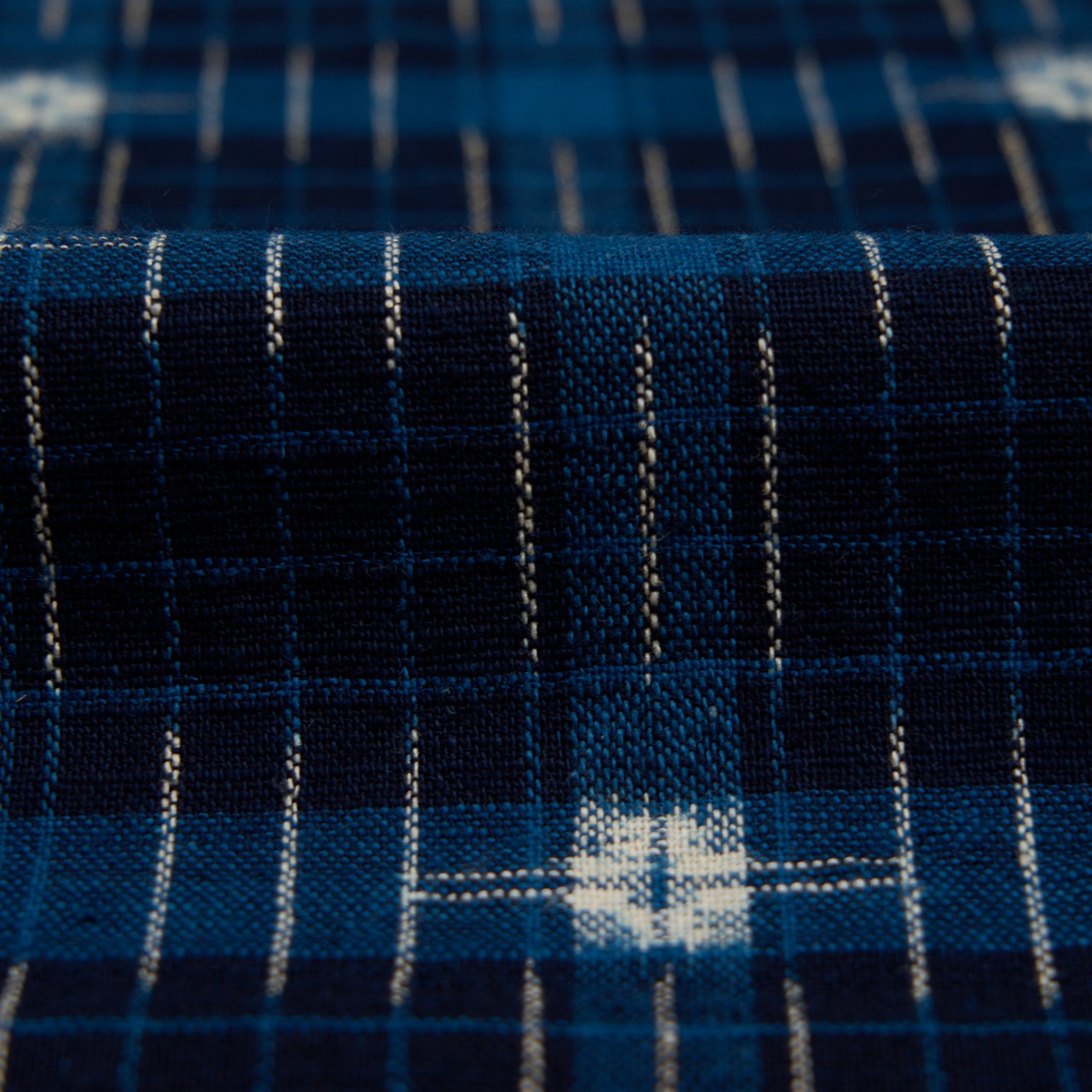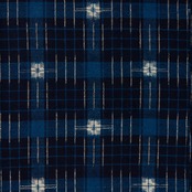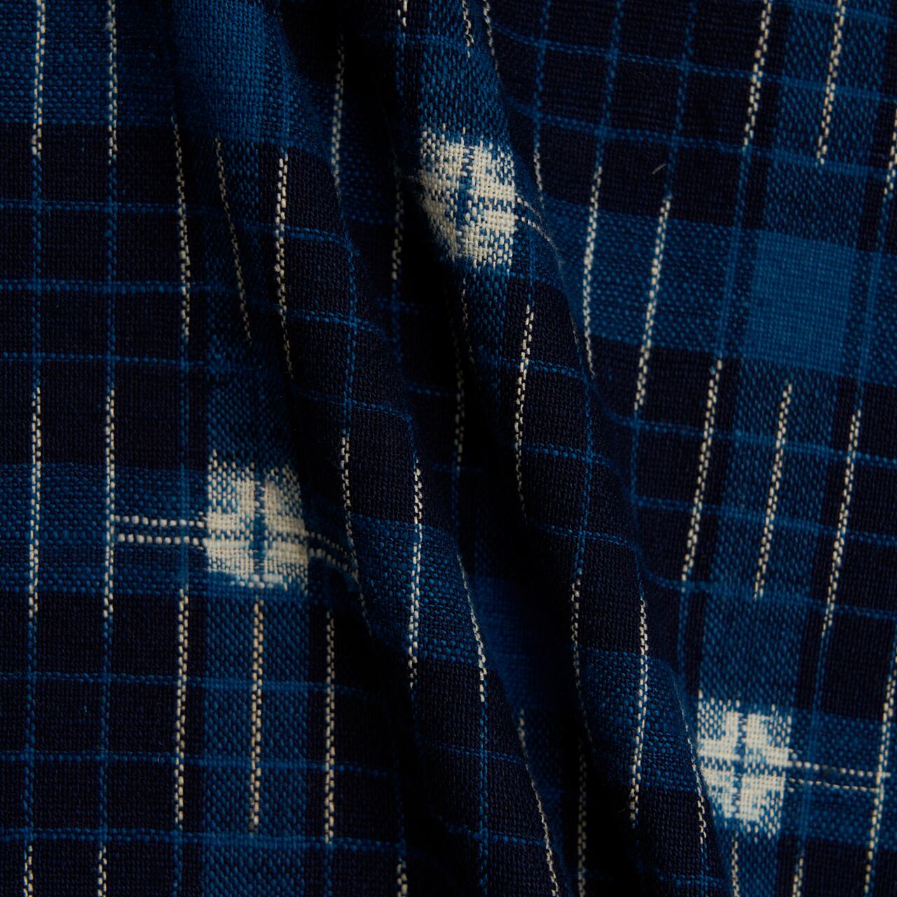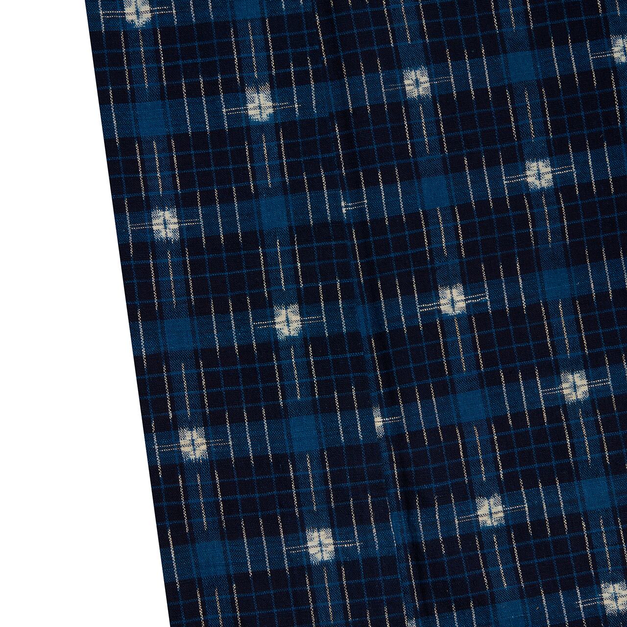 濃い藍色の地に、何段階か明るい藍・薄縹色の太めの格子と、それに重なるように細い格子が織られ、薄縹色の格子が交差するところには、太い十字絣のようなお花のような白い絣の模様が置かれ、その周りに3本ずつの短い絣縞が配置されるといった、とても複雑な模様が織り出されています。