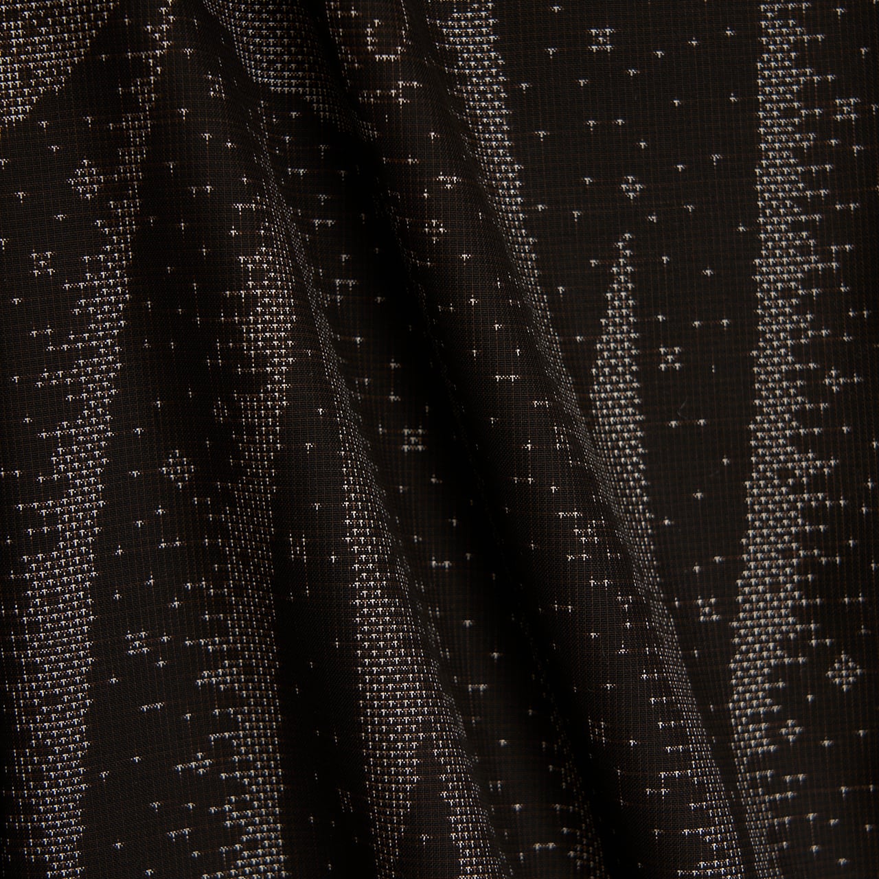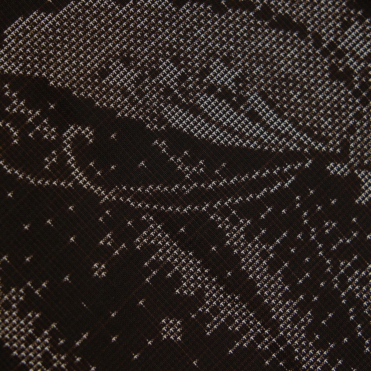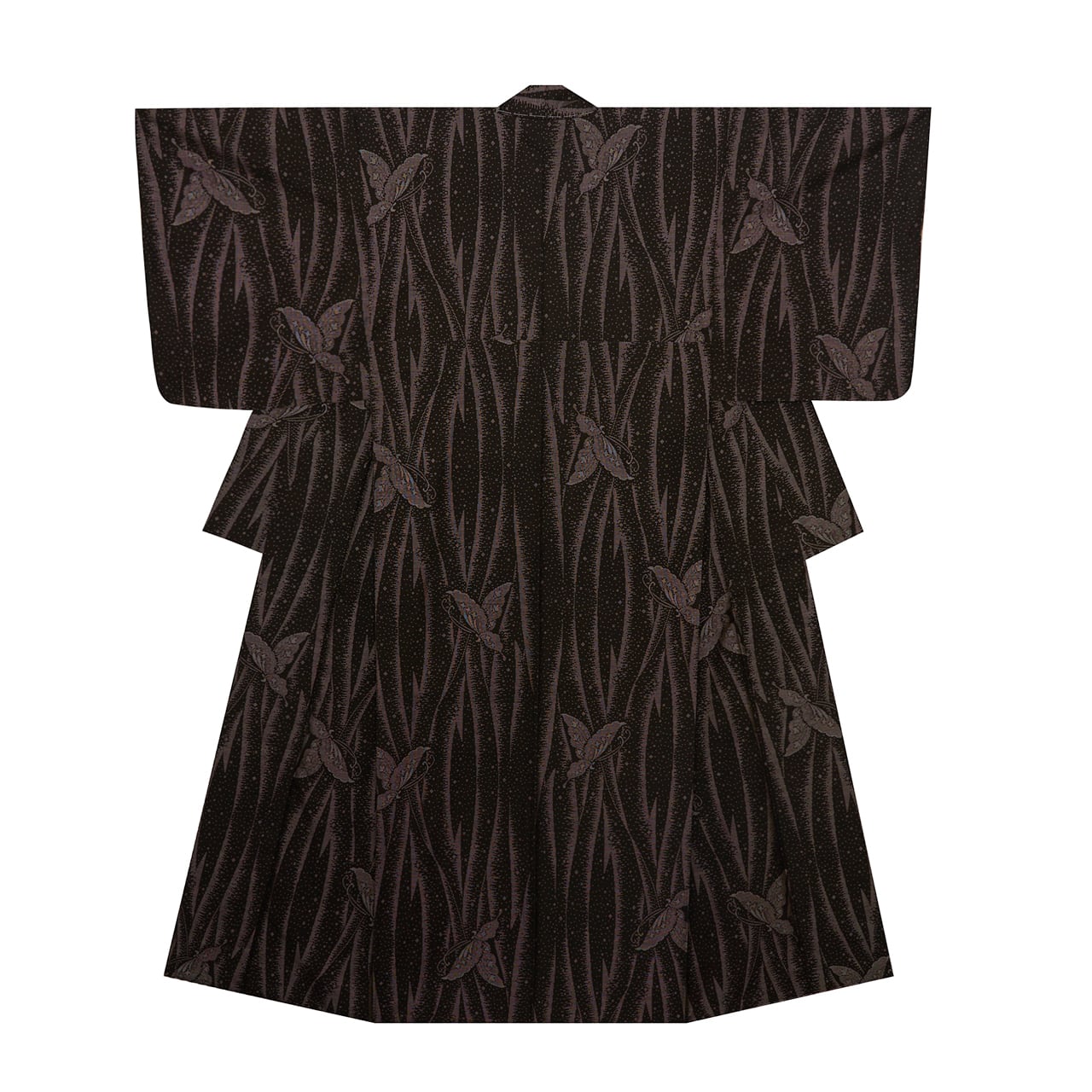 奄美の泥染めで染められた、黒に近いようなこっくりとした焦げ茶・赤墨色の地に、大きくうねるように縦縞の模様が取られ、そこに飛ぶやや大きめの蝶々の姿が、すべて9マルキのカタスの小さな絣の集合で構成された、大島紬ならではの絣の緻密さが魅力となった、幻想的な雰囲気の素敵なお着物です。