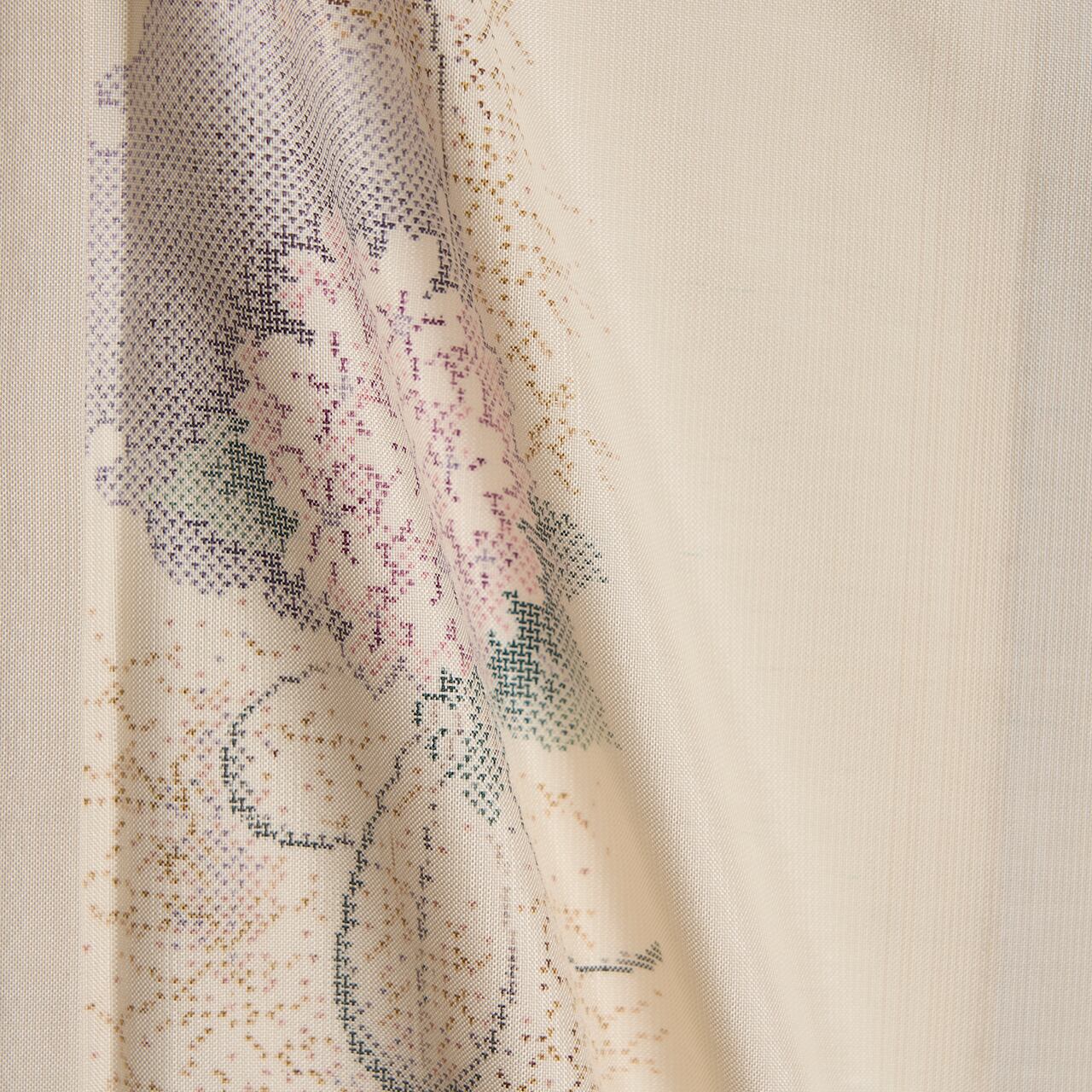こちらのお着物ですと、友禅の名古屋帯やすくい織や綴れ織などの名古屋帯などを合わせてお召しいただくと良いと思います。
