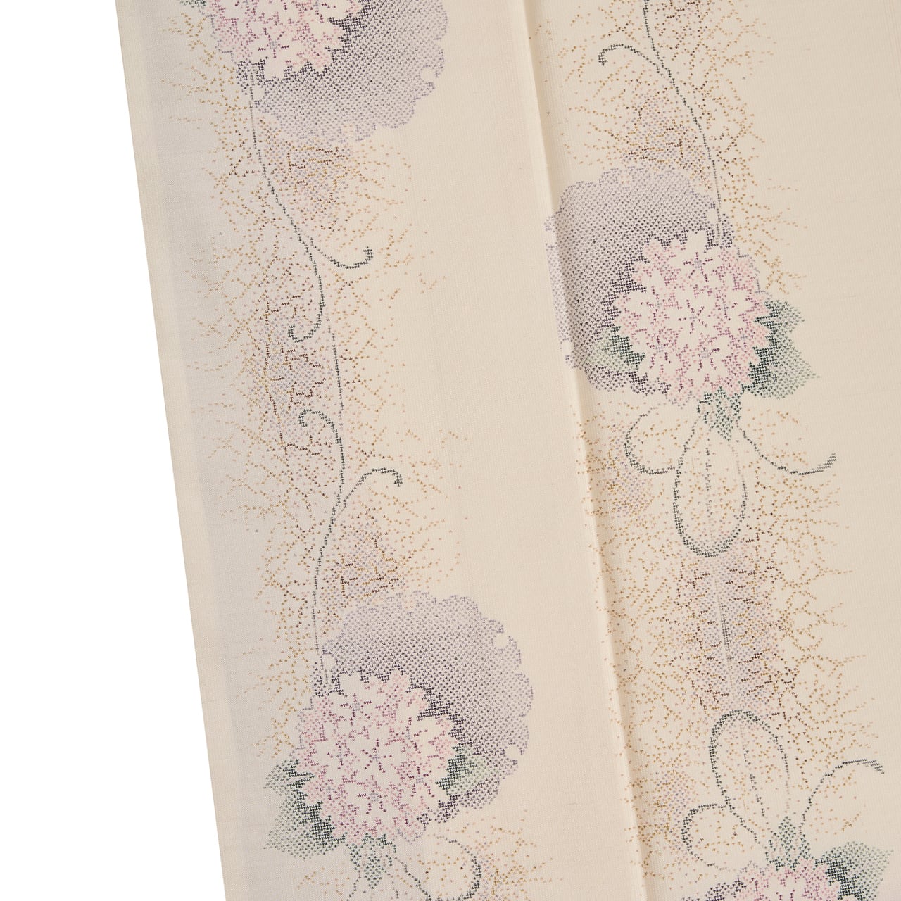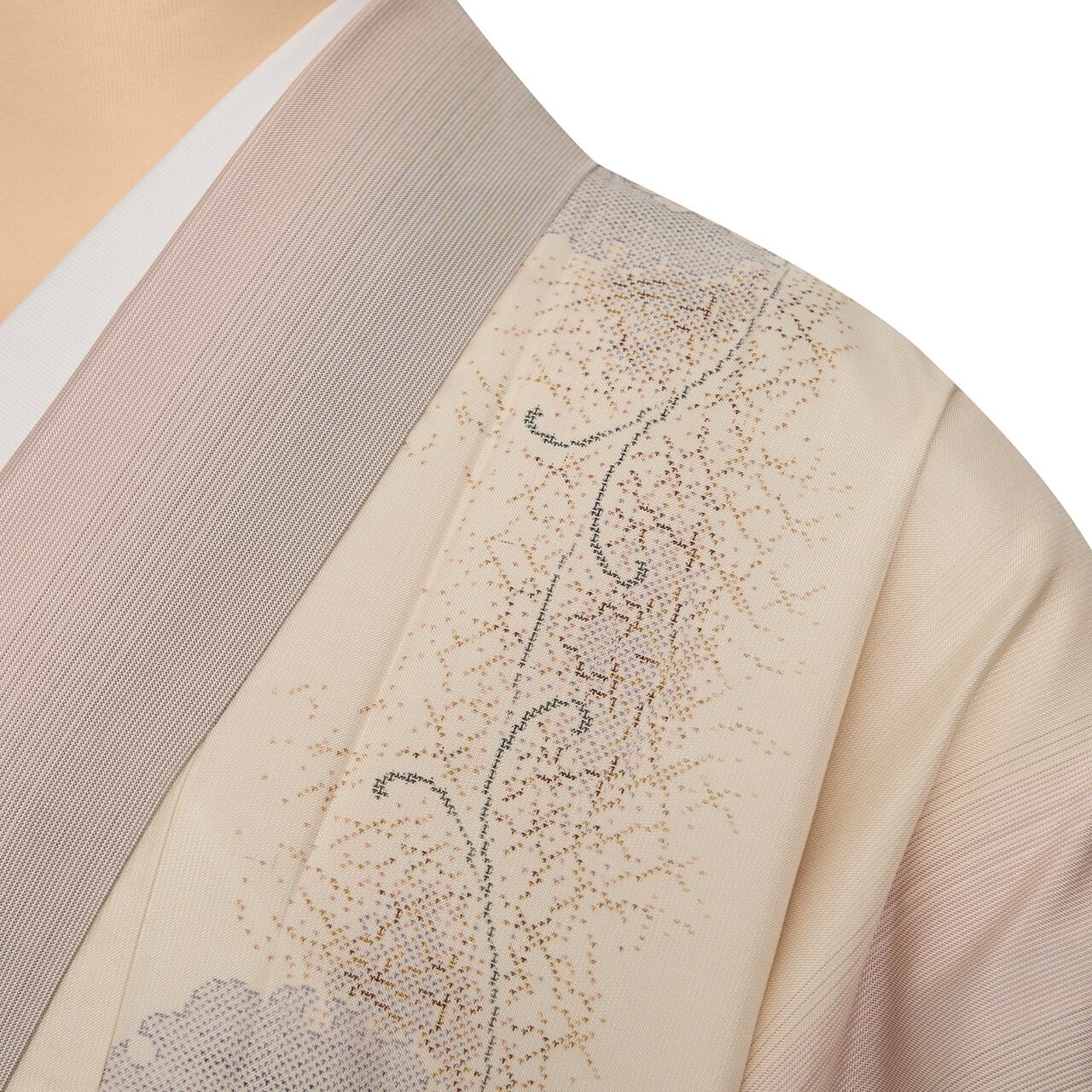 淡いベージュ・練色の地に、片側に絣と同じ色の藍味のあるグレー・鉄御納戸色と、紫味のあるピンク・浅蘇芳色の2色の細い縞がグラデーションのように織り込まれ、その反対側には雪輪に重なる桜のお花のくす玉が連なるように織り出された、清楚な雰囲気の中に華やかさのある、素敵な白大島紬のお着物です。