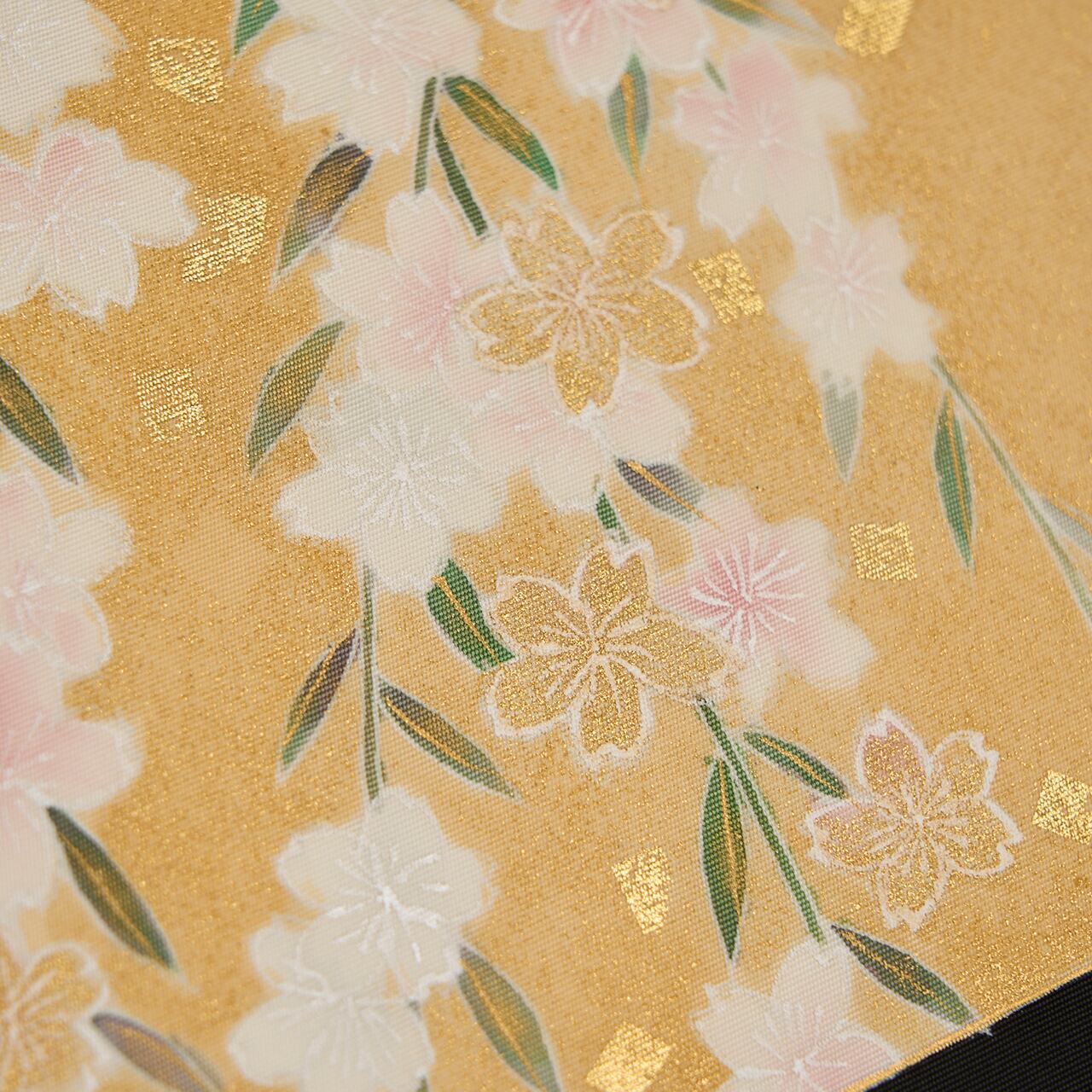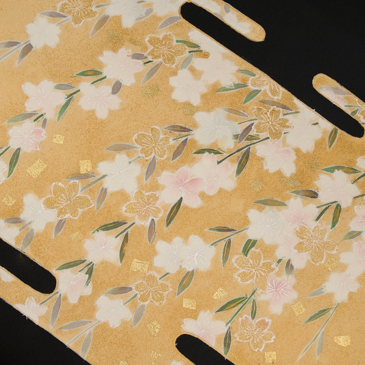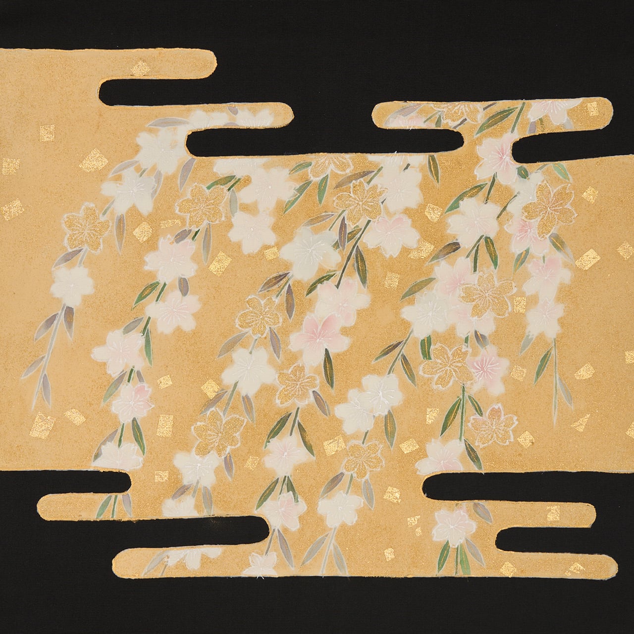 黒の塩瀬の生地のお太鼓にエ霞の形が取られ、まったりとした黄色味のあるベージュ・砥粉色に染められて細かな金粉が散らされ、それを背景に枝垂れて咲く桜のお花が友禅で描かれ、小さな紙吹雪のような金箔まで施された、春をテーマにした華やかな九寸名古屋帯です。