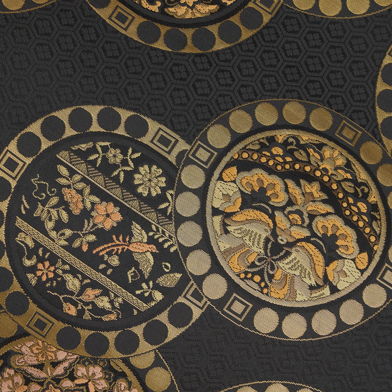 真っ黒ではなく、少し藍味のある濃いグレー・藍墨茶色の地に、花菱の入った小さな亀甲文様が織られ、そこにやや大きめの連珠文が取られて、その中には極細の金箔の糸と何色かの糸で、たくさんの種類の正倉院文様が織り出された、格調高さのある素敵な袋帯です。