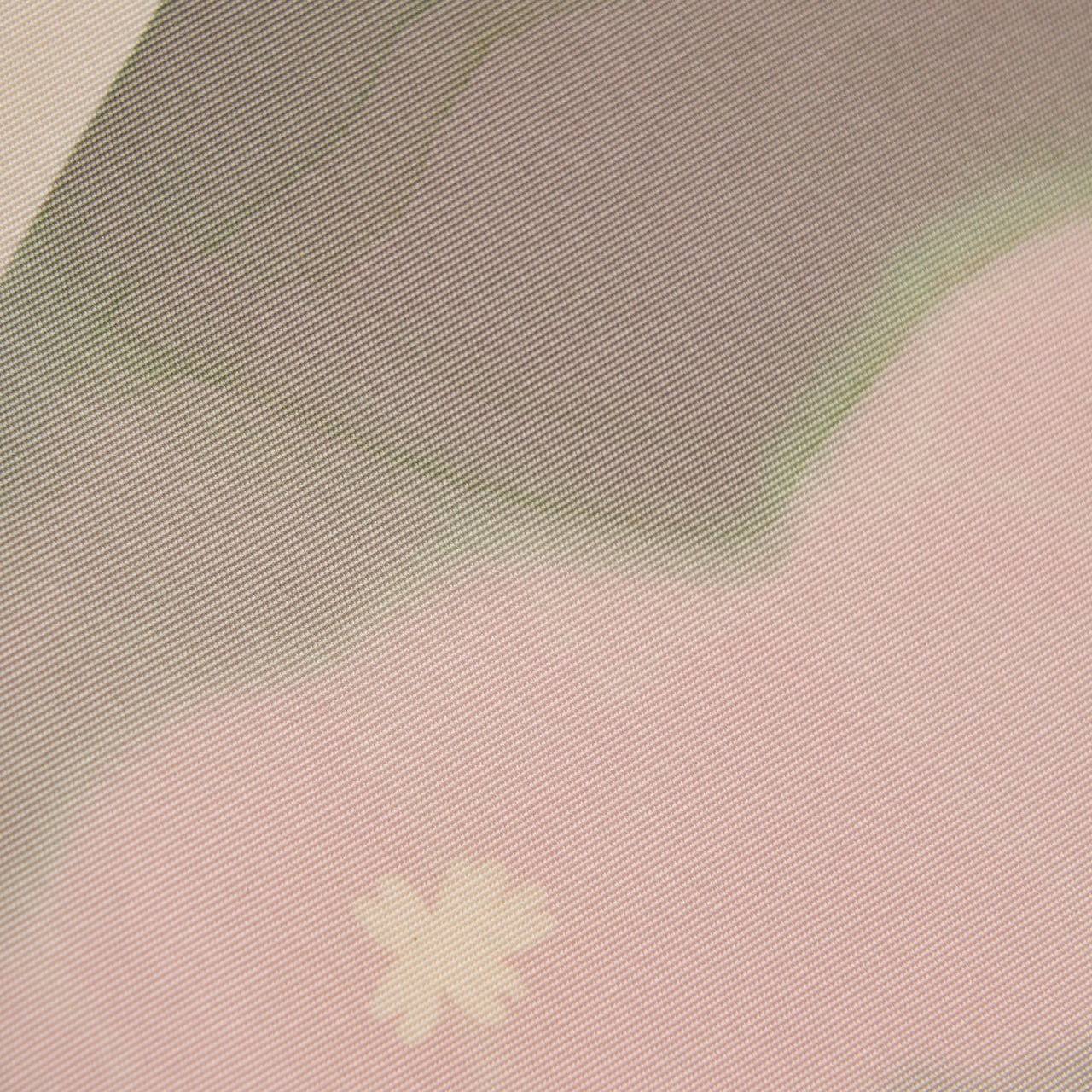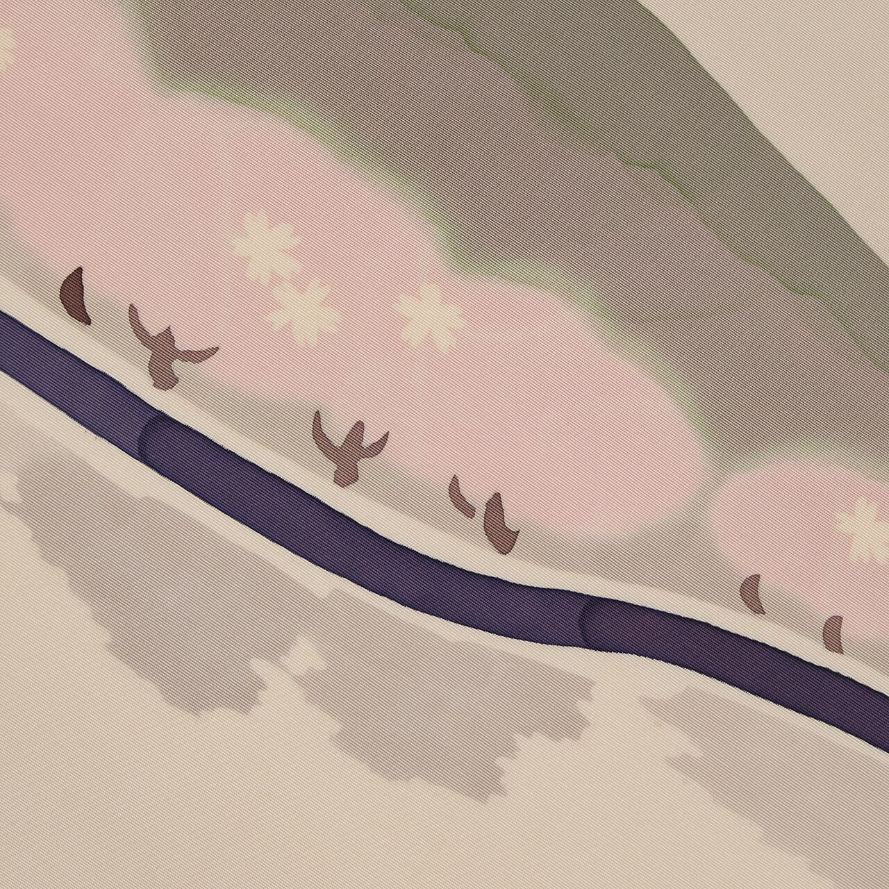 象牙色の塩瀬の生地のお太鼓に、桜並木のある山の風景が手描きの蝋纈染で描かれた、やわらかい風が吹いているようなのどかな雰囲気が素敵な九寸名古屋帯です。