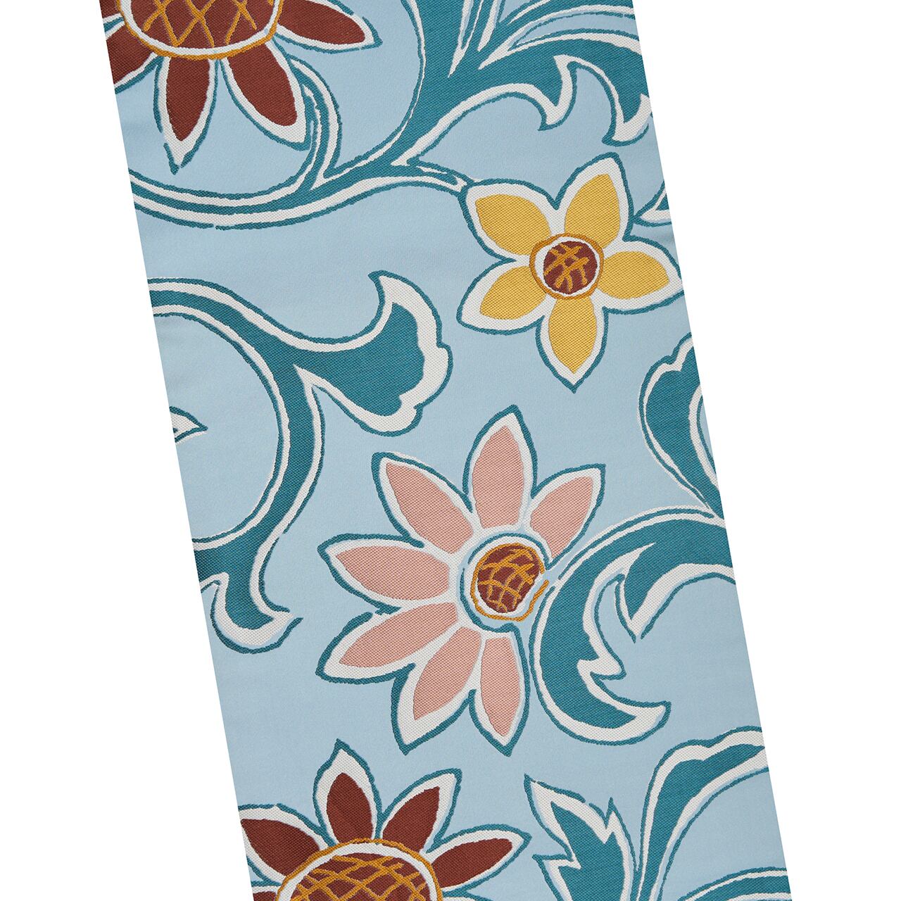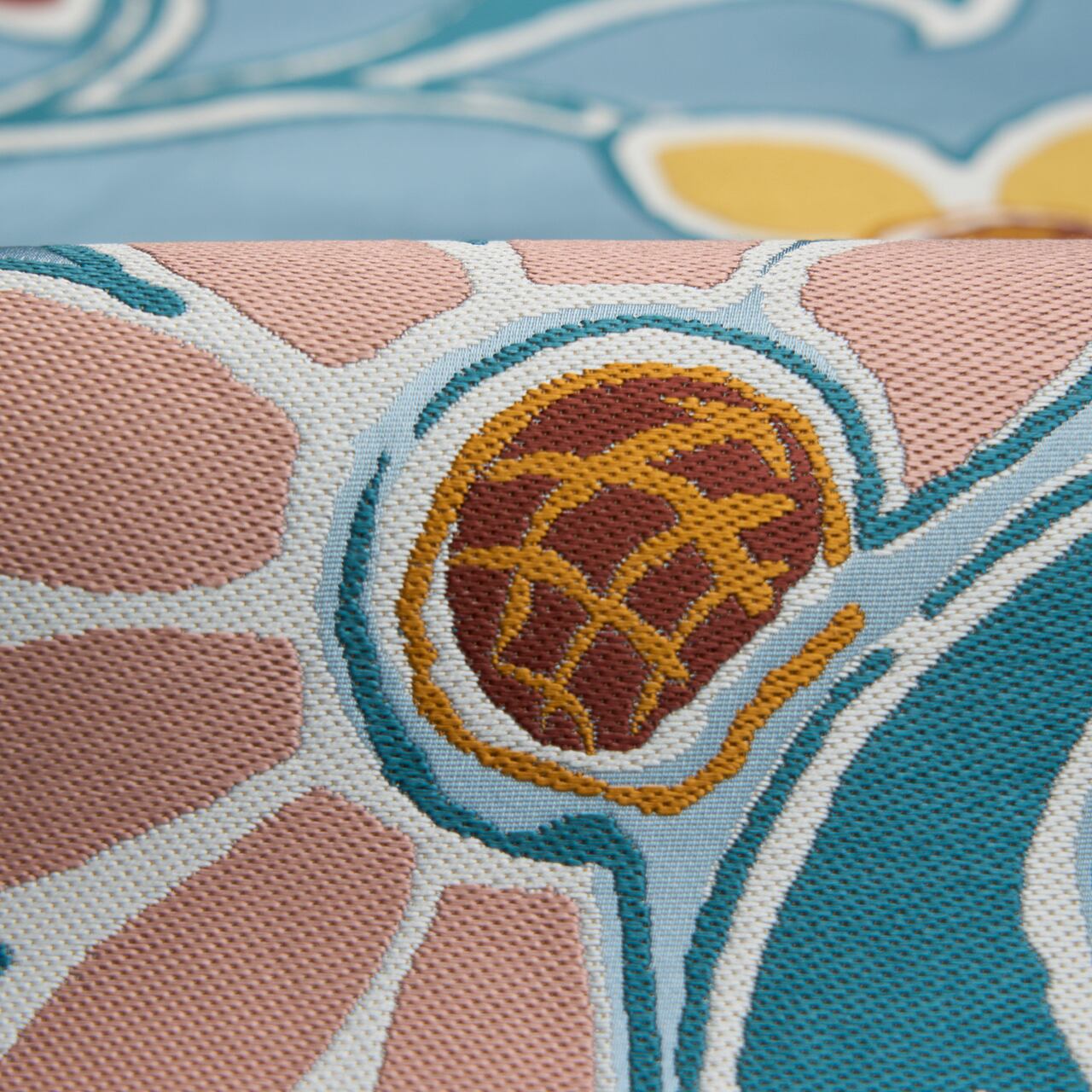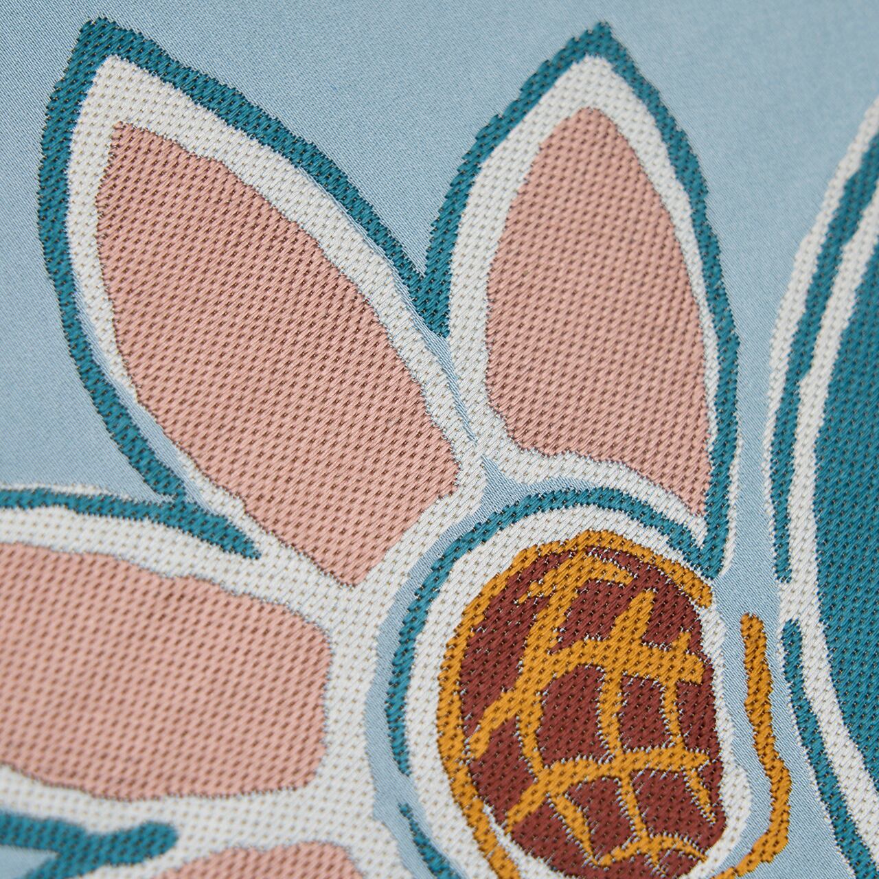お花は、淡黄色の綺麗な黄色、水柿色の淡いピンク、錆色の臙脂っぽい茶で織られ、中心は赤朽葉色のオレンジで、ひまわりのお花のような模様となっています。
