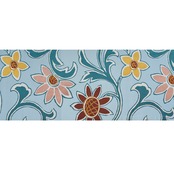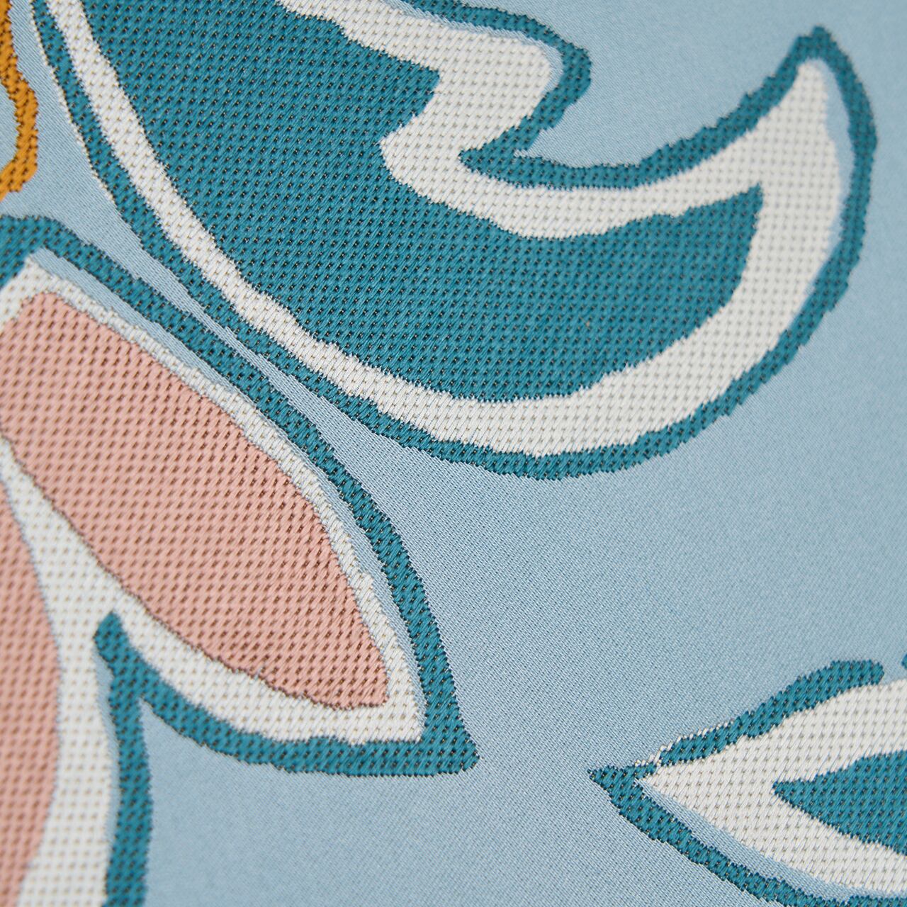 澄んだ爽やかなブルー・浅縹色の地に、躍動感のある蔓草が大胆な調子に織られ、それを背景に大きなお花が色とりどりに咲く姿が織り出された、ポップな感じに弾むような楽しさのある、素敵な九寸の開名古屋帯です。
