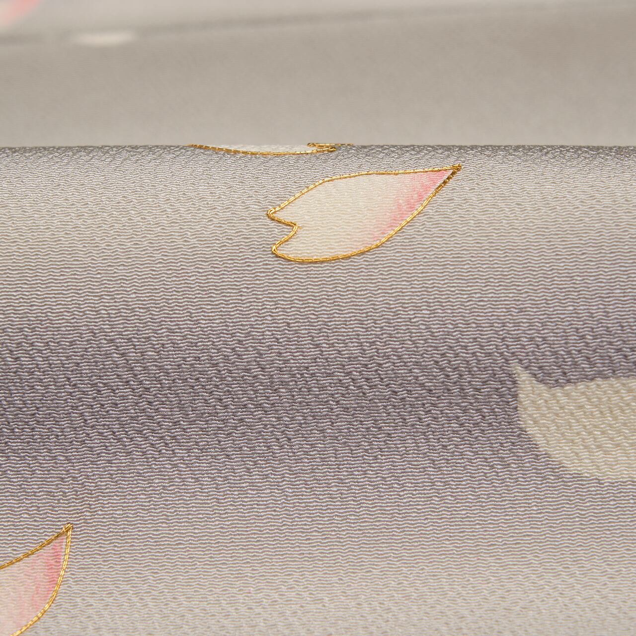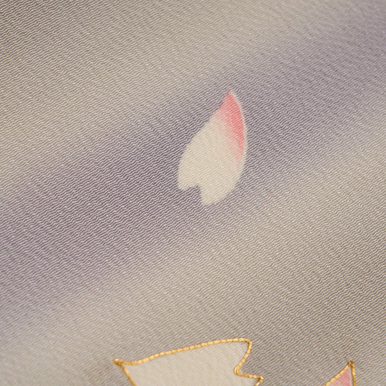 少しシボのあるちりめんの生地が、灰黄緑色のとても淡いグレーをベースに、薄鼠色の薄紫と、緑味のあるグレー・青白橡色の横段が霞のように暈しで染められ、そこにはらはらと舞う生成り色の桜の花びらが散らされて、それにも暈しで紅を挿したような紅紅梅色が染められ、金駒刺繍も施された、とても風情のある素敵な九寸名古屋帯です。