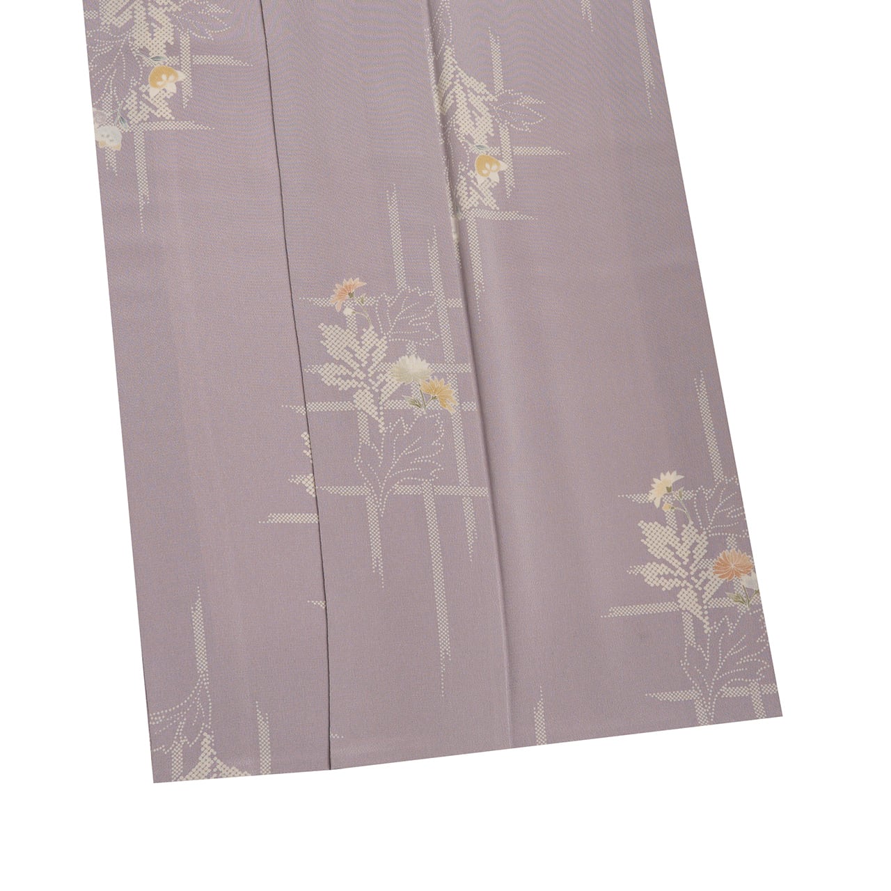 少しシボがある一越ちりめんの生地が、淡く澄んだイメージの薄紫・暁鼠色に染められて、飛び飛びに竹垣の格子が置かれ、そこに菊と橘のお花が咲いている様子が型友禅で染められた、洗練された大人の雰囲気のある素敵な小紋のお着物です。