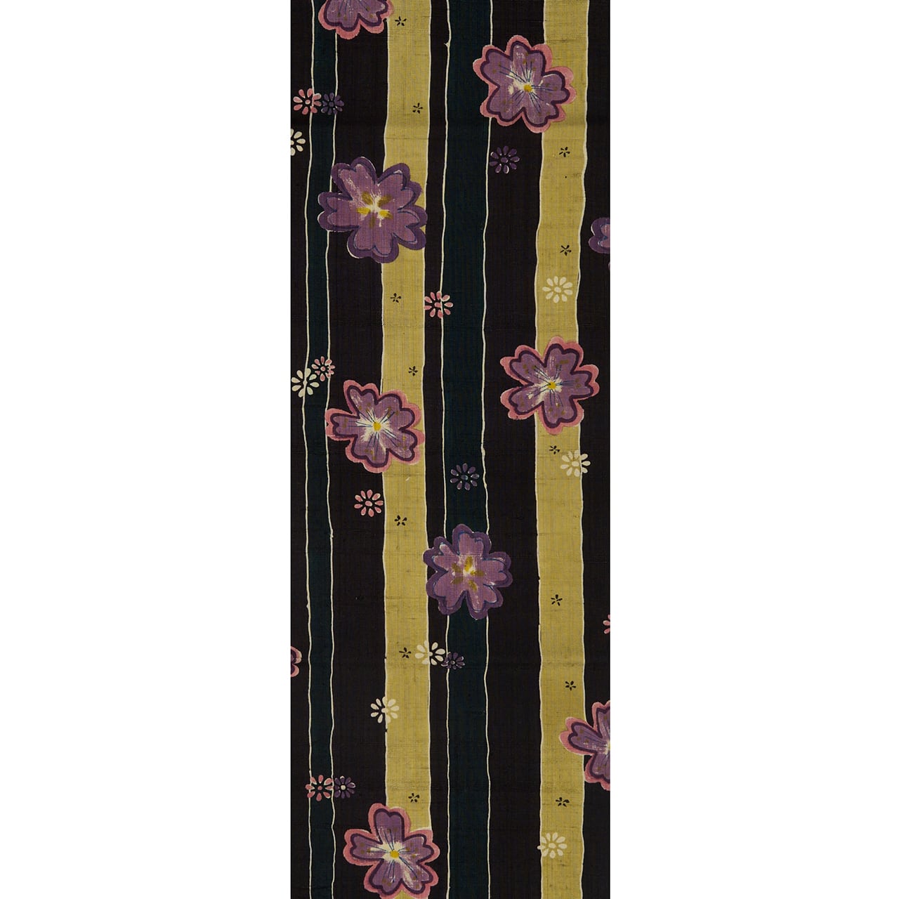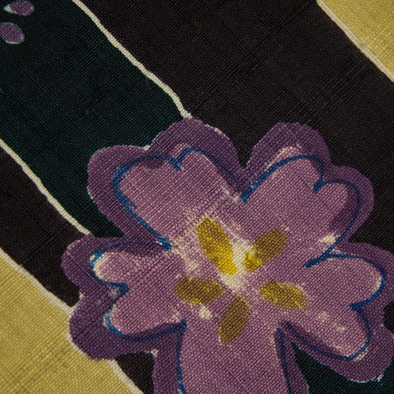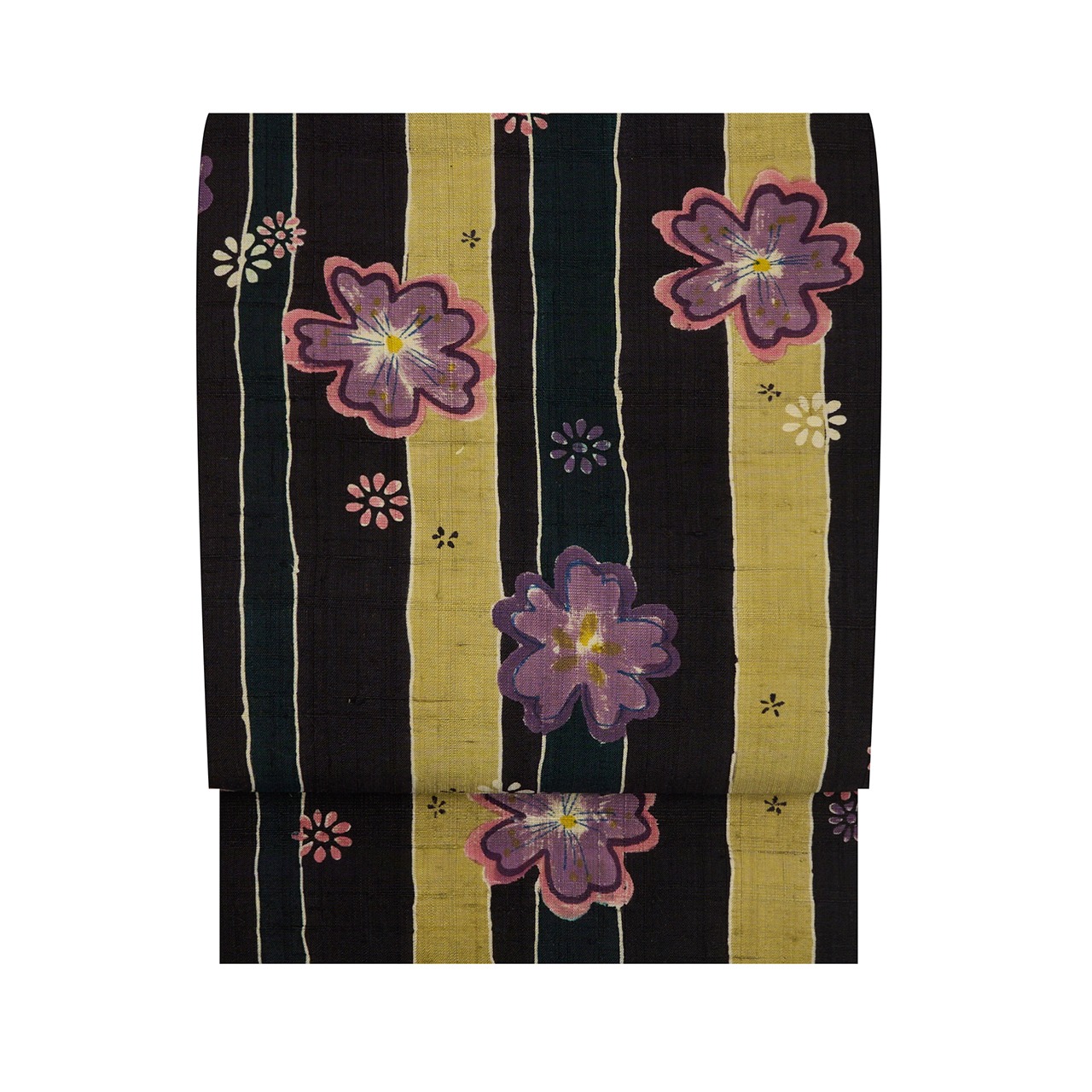 横にざっくりとした節のある座繰りの生紬のような張りのある生地に、黒と高麗納戸色の濃い緑、緑黄色の黄色の手描きの縞模様が、歌舞伎の定式幕のような大胆な調子で全体に引かれ、そこにやや大ぶりな桜のお花がダイナミックにやはり手描きされ、そのまわりにはちいさなお花が散りばめられた、アーティスティックなお洒落な九寸の開名古屋帯です。