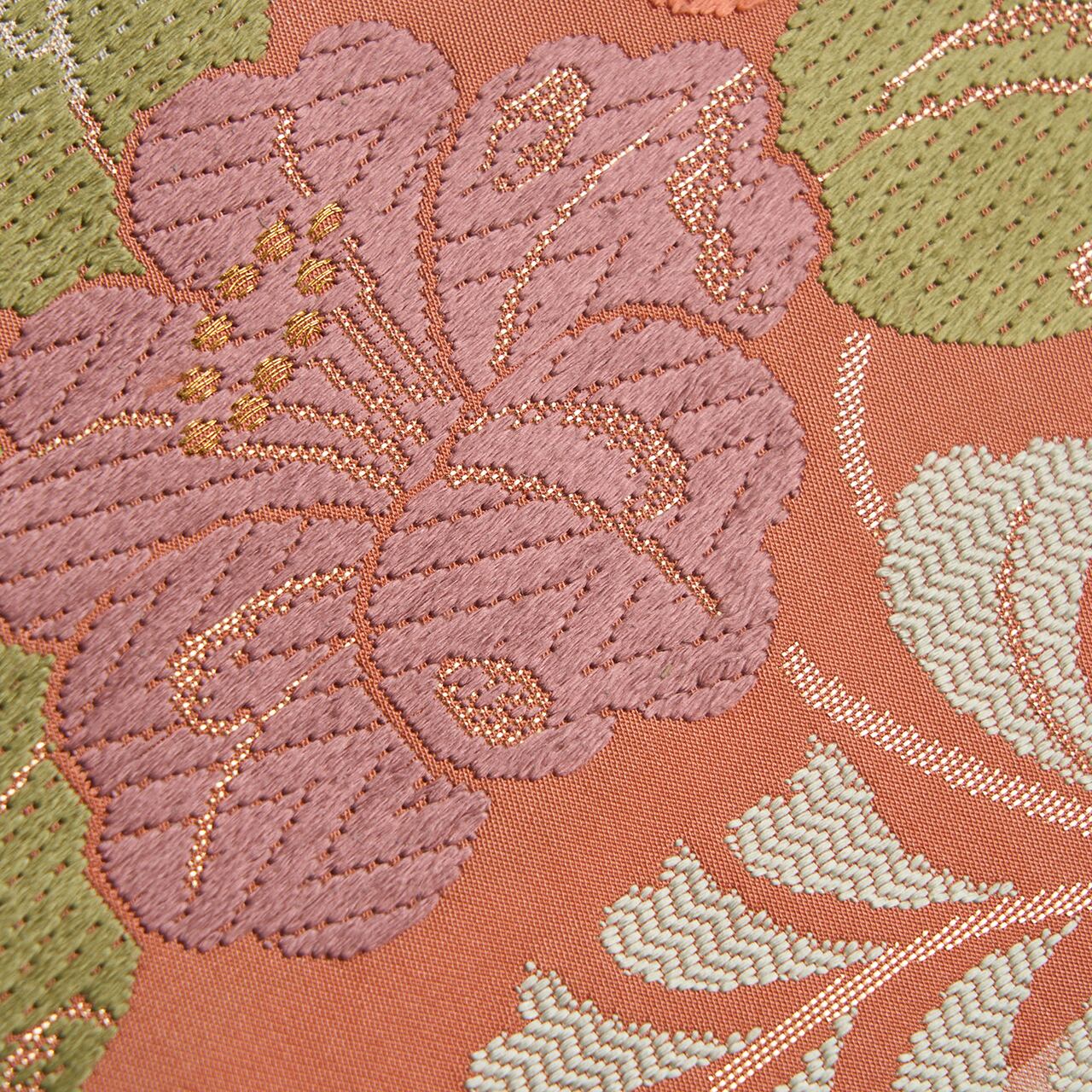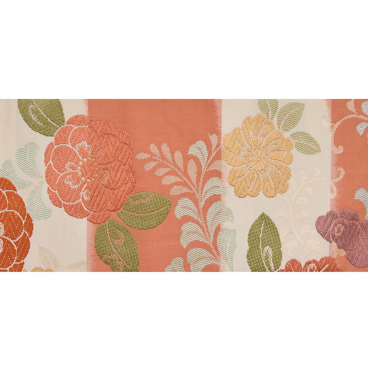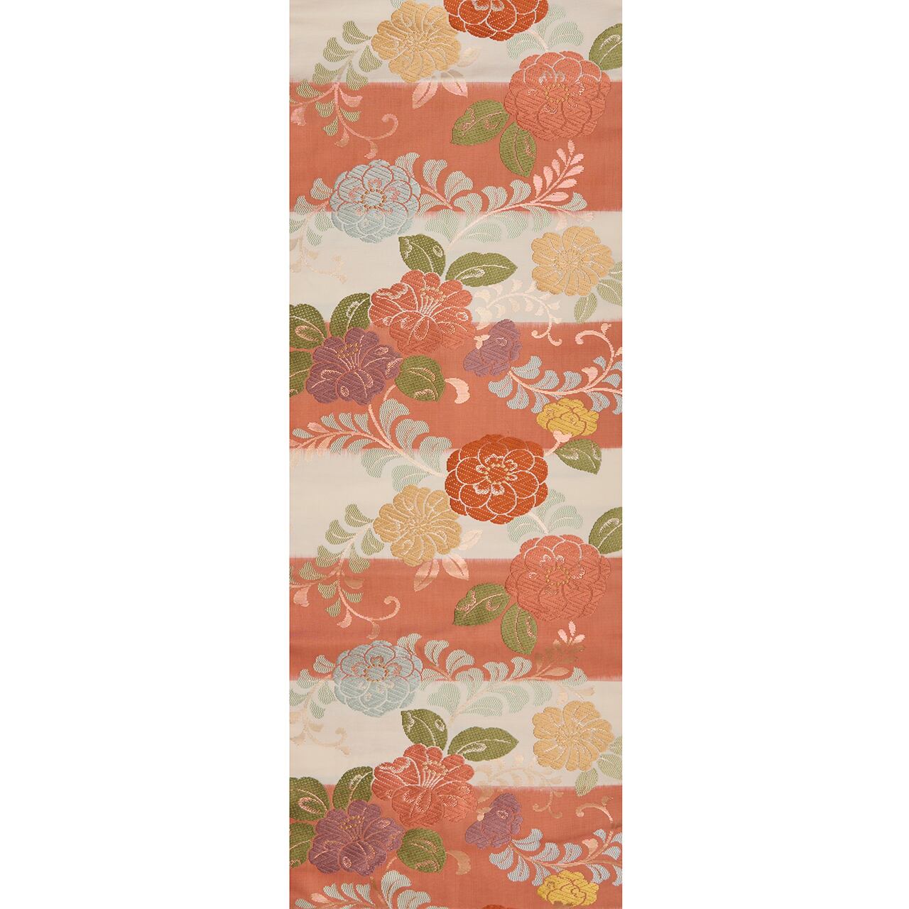 象牙色の地に、明るく淡い朱色・甚三紅色の糸で、段変わりに熨斗目の模様が織り出され、そこに蔓草と椿のお花や、桜、梅、菊をアレンジしたようなお花が、秘色色の淡い水色、芥子色の黄色、代赭色の朱色などの糸で唐織で織り出された、華やかな雰囲気のある素敵な九寸名古屋帯です。