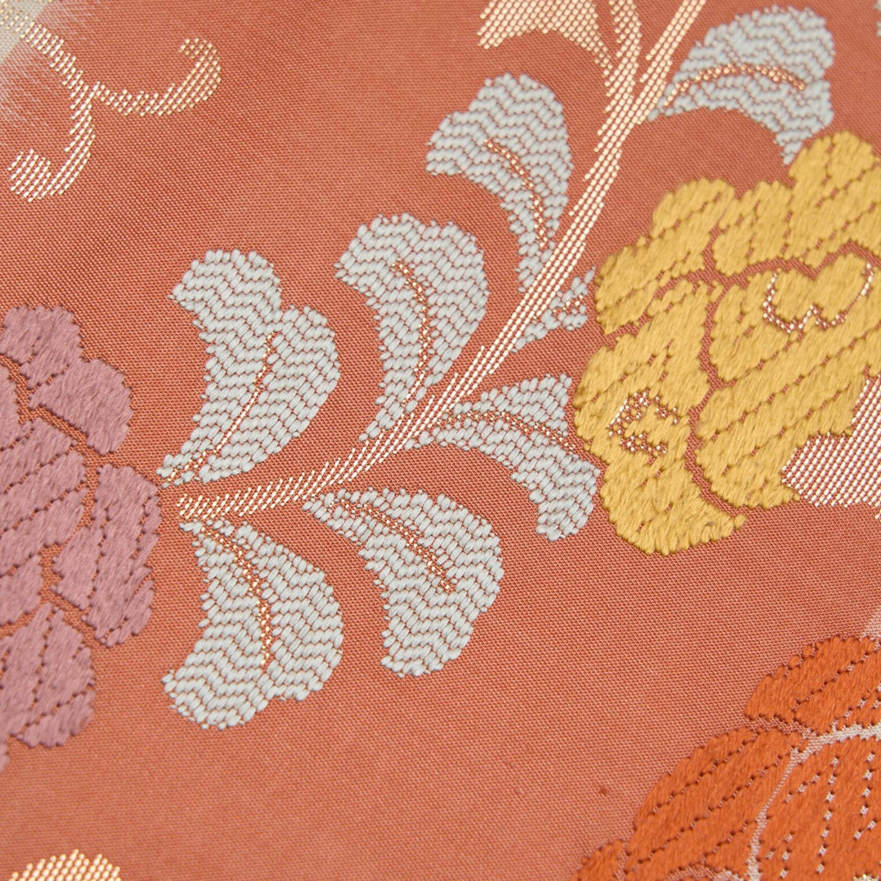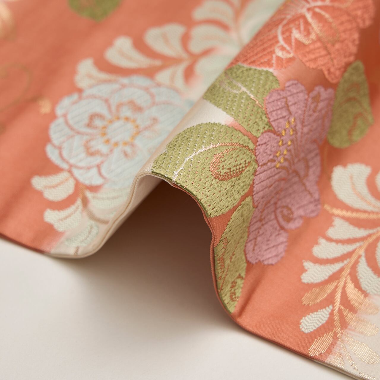 象牙色に甚三紅色の熨斗目の模様も、境目には絣足が見えてとても素敵な雰囲気となっていますし、唐織で織り出されたお花もパステル調のやさしい色が使われていて、色とりどりで本当に華やかな帯となっています。