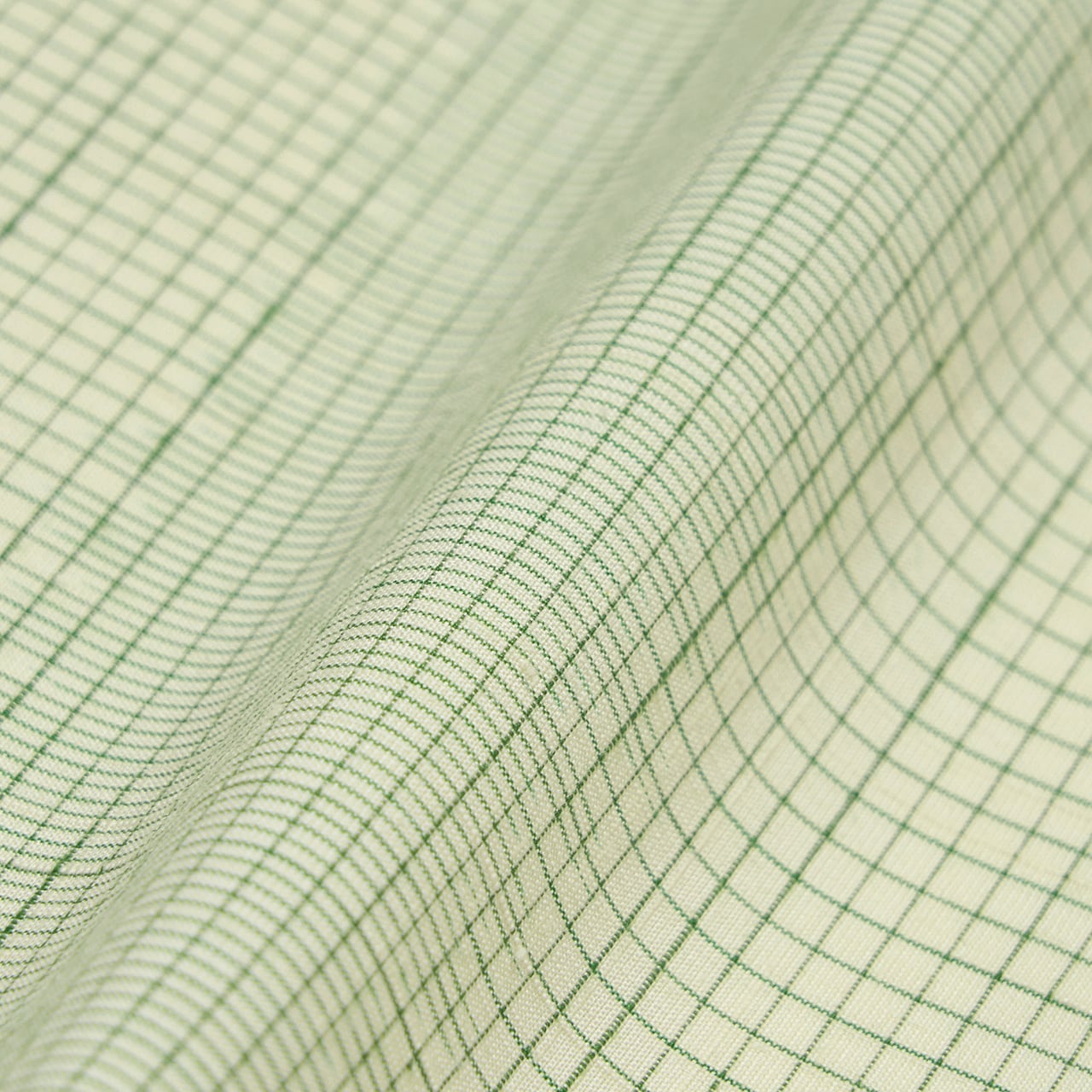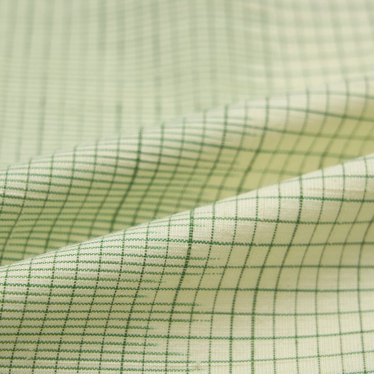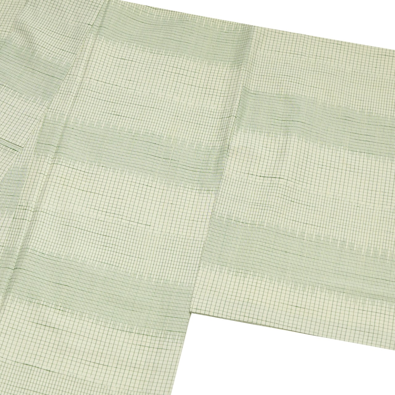 生成り色の地に、段ごとに幅を変えて織られた千歳緑色の格子がとてもすっきりと綺麗に目に映りますが、緑色の濃さが違って見えるのはそれぞれに括られた絣で経糸が染められているためで、とても手の込んだものだという事がわかります。