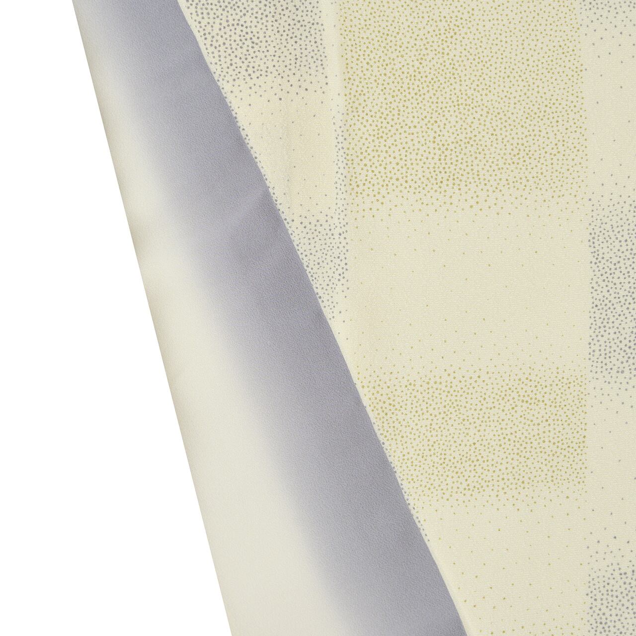 非常に細かい点描のような模様が、市松の四角の集合になっていたり、その境目は消え入るように染められていたり、やさしく気品のあるお着物となっています。