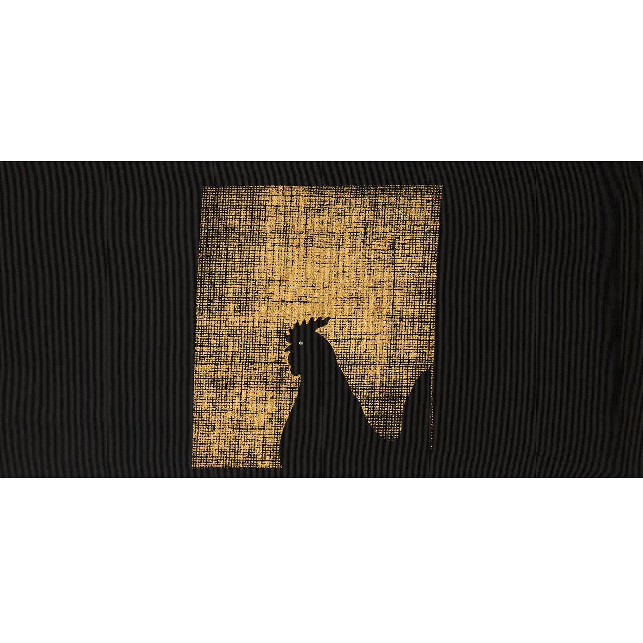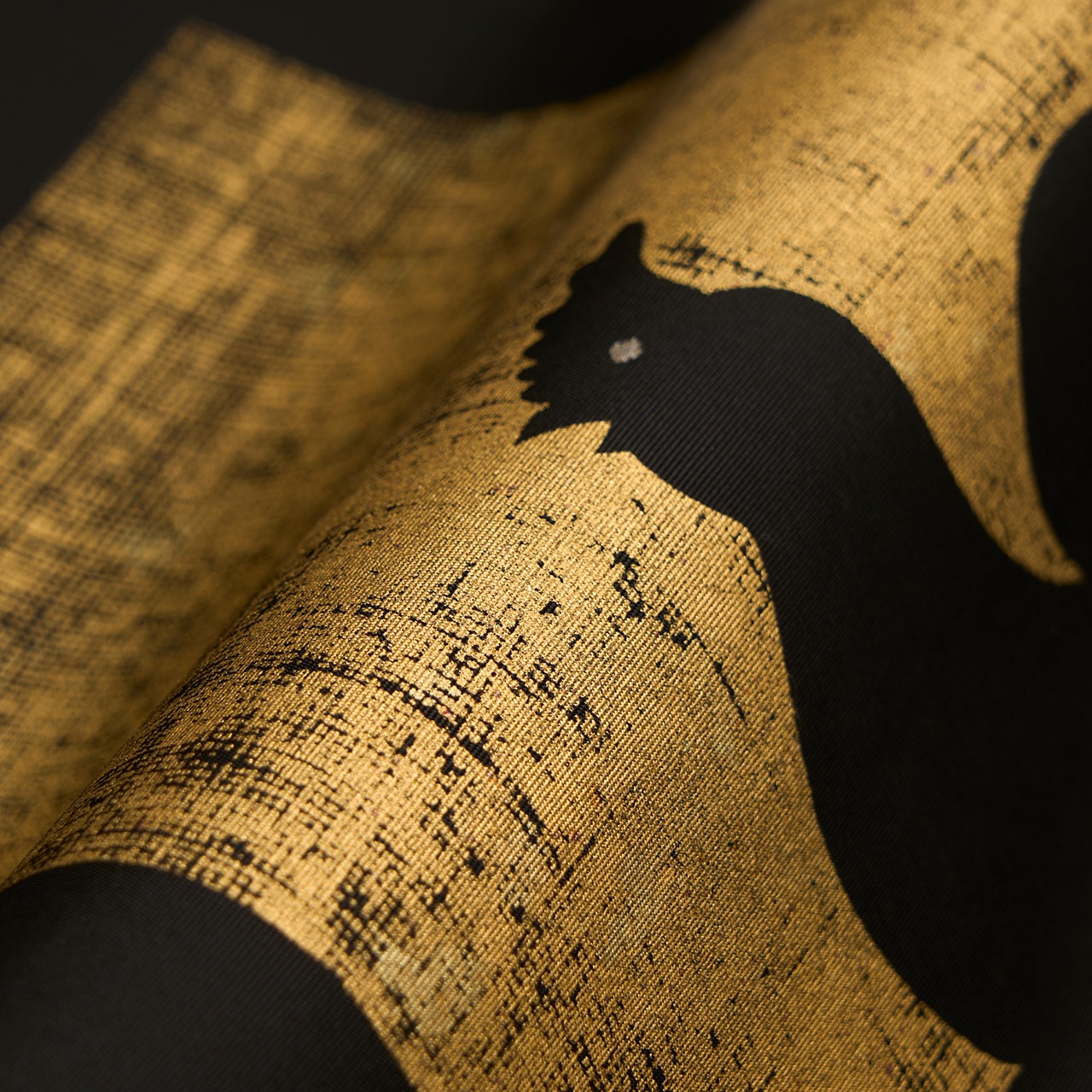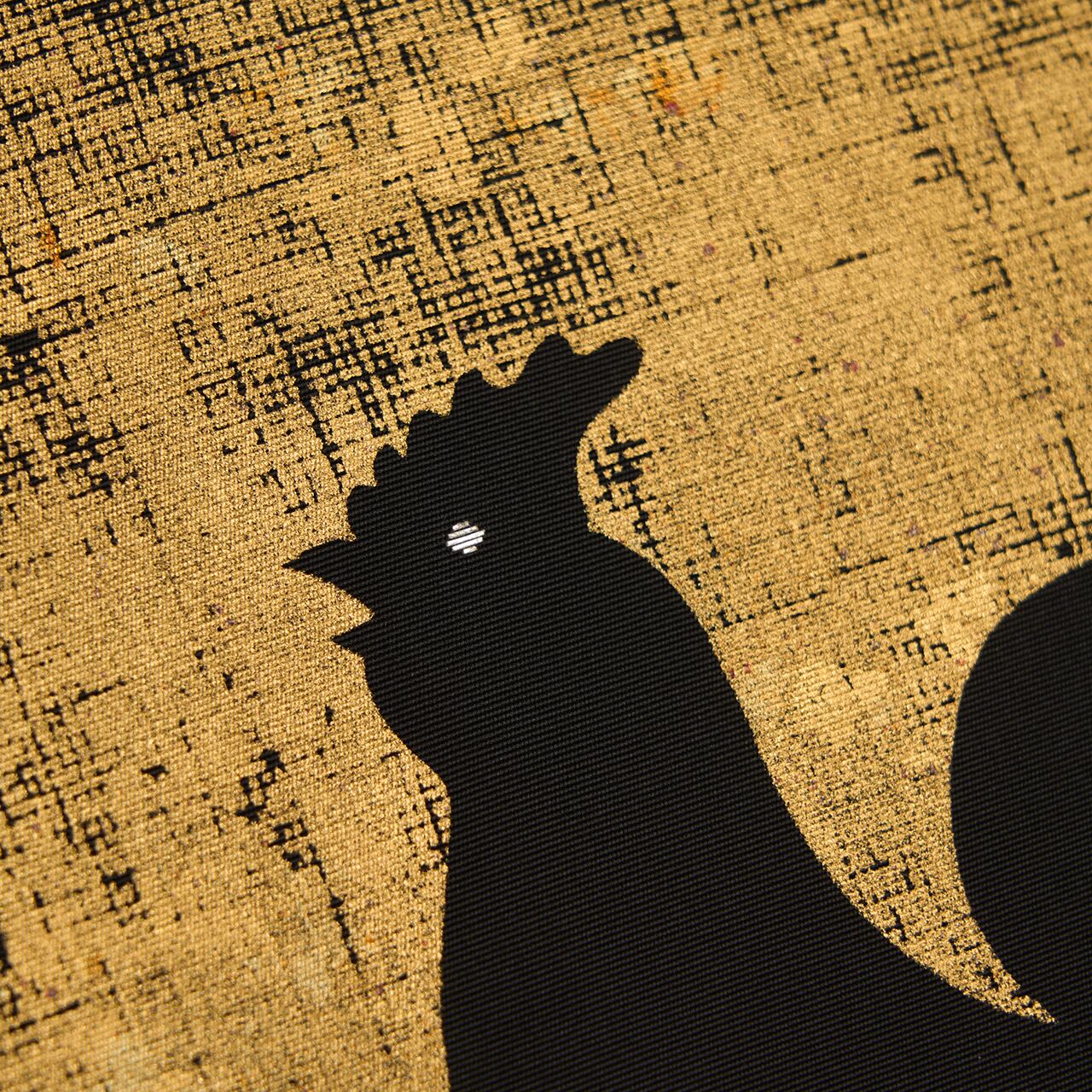 しっかりとした質感の黒の塩瀬の生地に四角が取られて、細かいみじん格子の模様のある金の摺り箔が施され、それを背景に悠々とした姿の雄鶏がシルエットのように黒く染め抜かれた、ユニークなデザインのお洒落な九寸名古屋帯です。