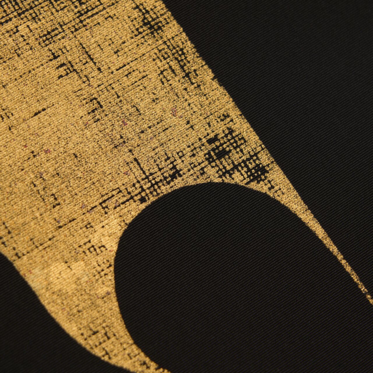 シンプルなシルエットの模様となっていますが、金の摺り箔の加工で緻密なみじん格子が施されていたり、鳥のまわりはシルエットがくっきりするようにマットな感じにされていたり、鳥の目は極細の銀の糸で手刺繍されていたりと、非常に丁寧なお仕事ぶりが見られます。