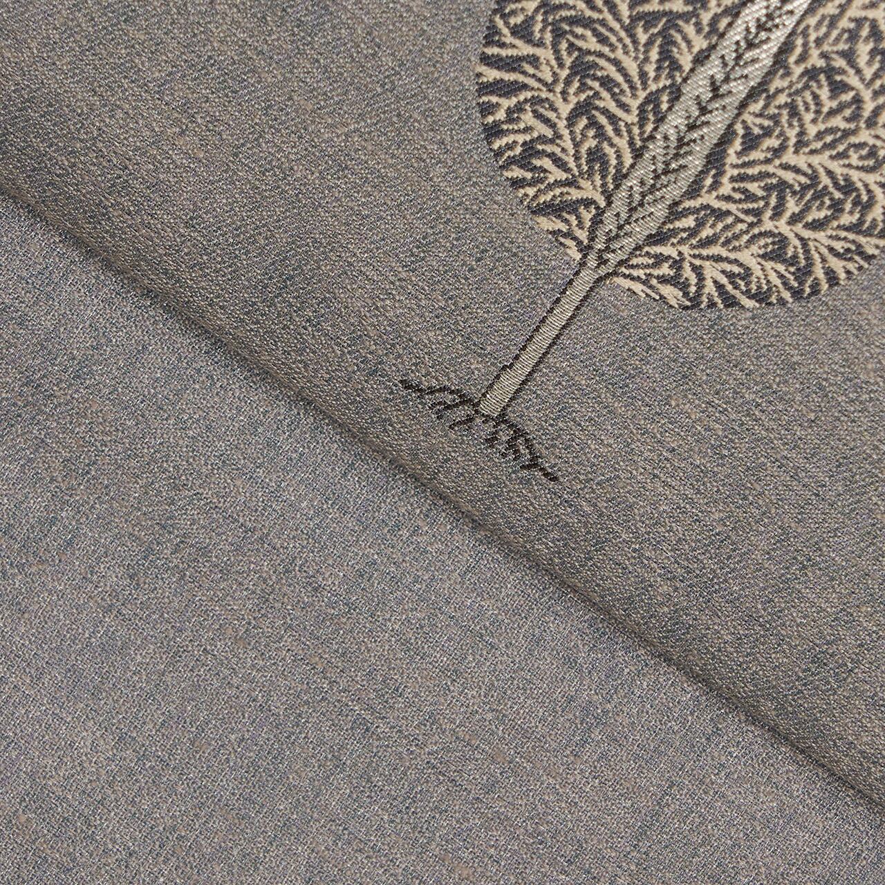 少しザラっとした質感で、合いの季節の紳士服のコートの生地のような面白い風合いの、淡いグレー・薄鈍色の紬地に、糸杉のようなすらっとした樹が3本立っている図案が織り出された、モノトーンのとてもお洒落な二部式の開名古屋帯です。