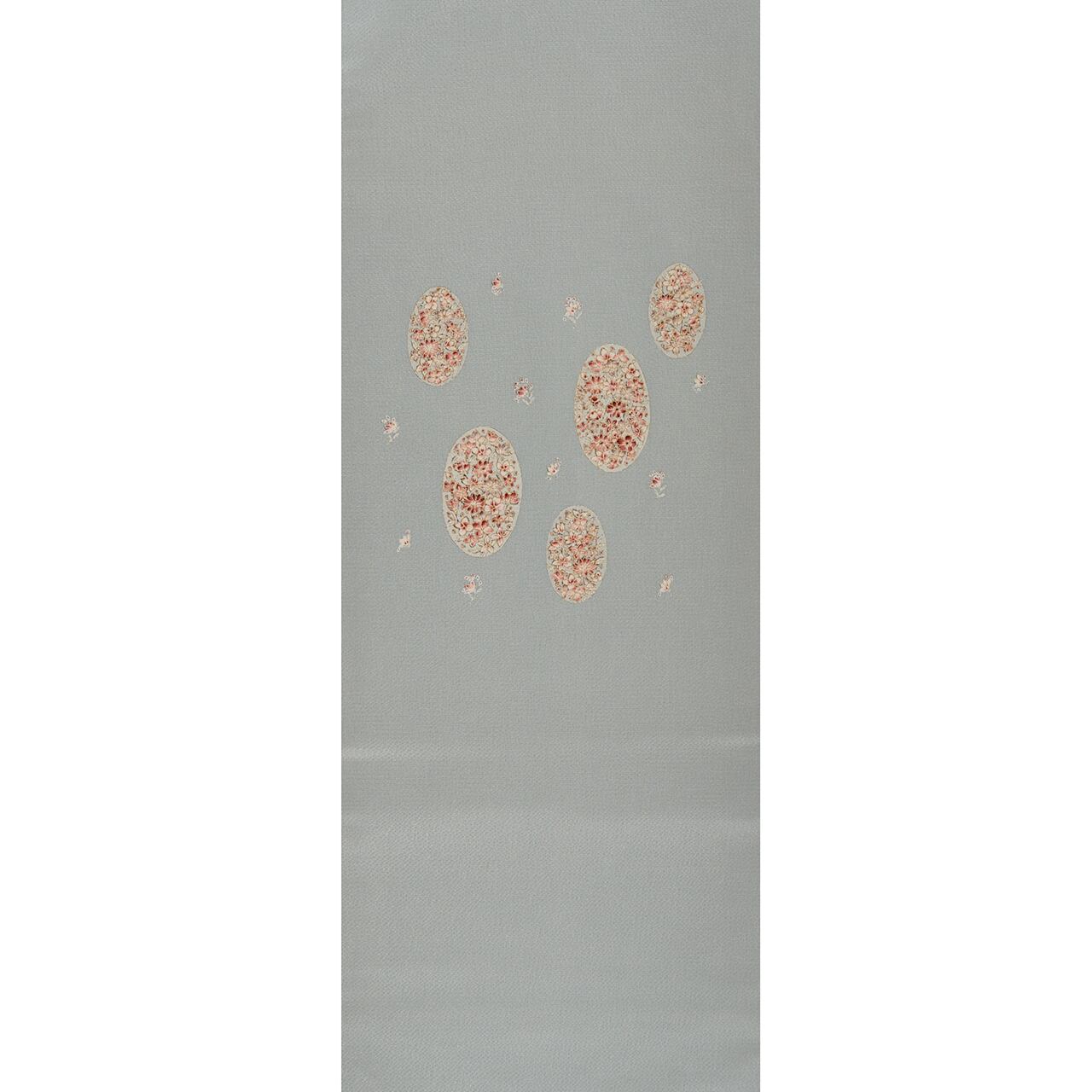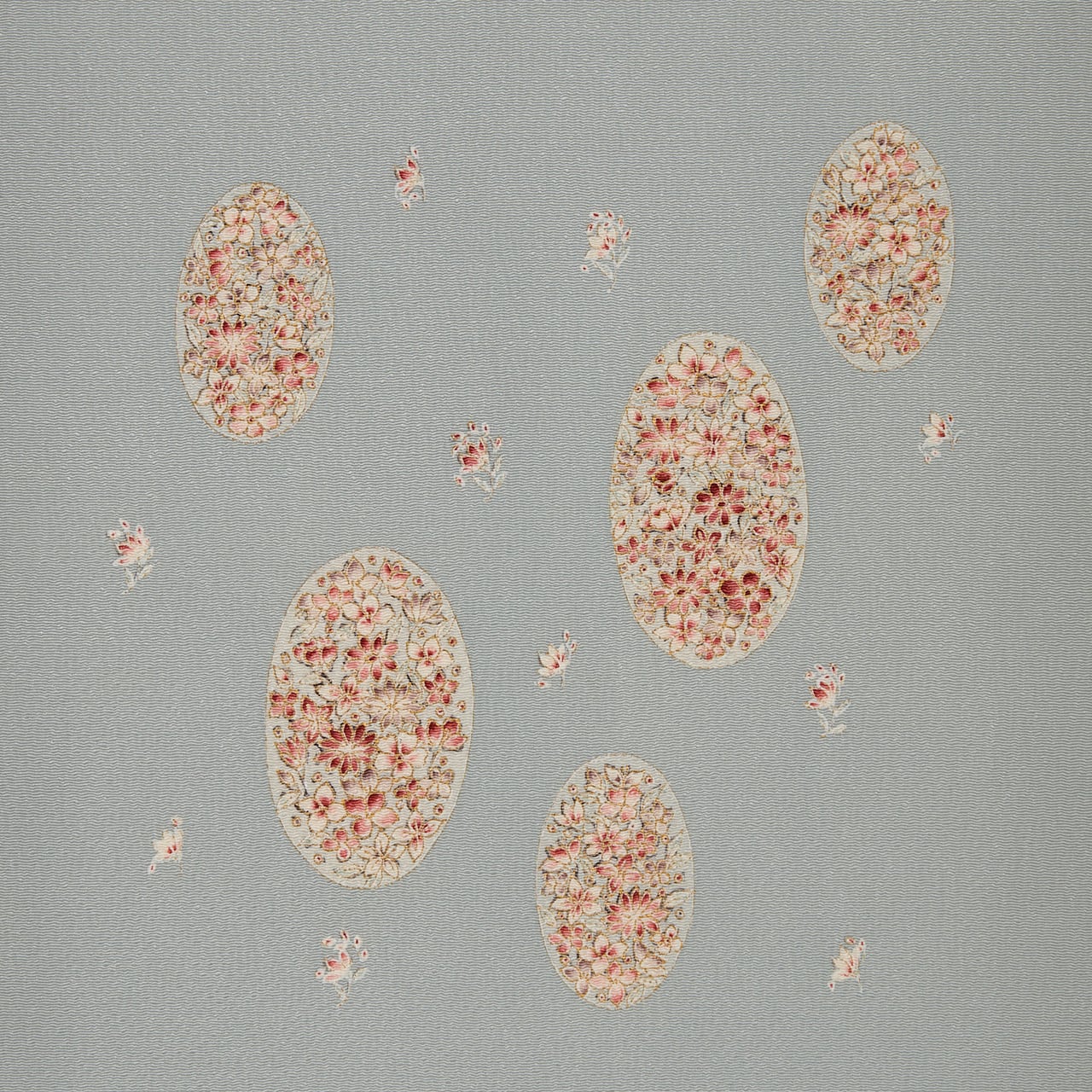 少しシボのあるちりめんの生地が淡い水色・シャドウブルーに染められ、お太鼓に縦に長い楕円形が取られ、その中は一段薄い水色・スモークブルーで染められて、そこに小さなお花がびっしりと咲いて、丸の外にも少し散っているような、そんな様子が細やかな手描きで描かれた清楚な印象の九寸名古屋帯です。