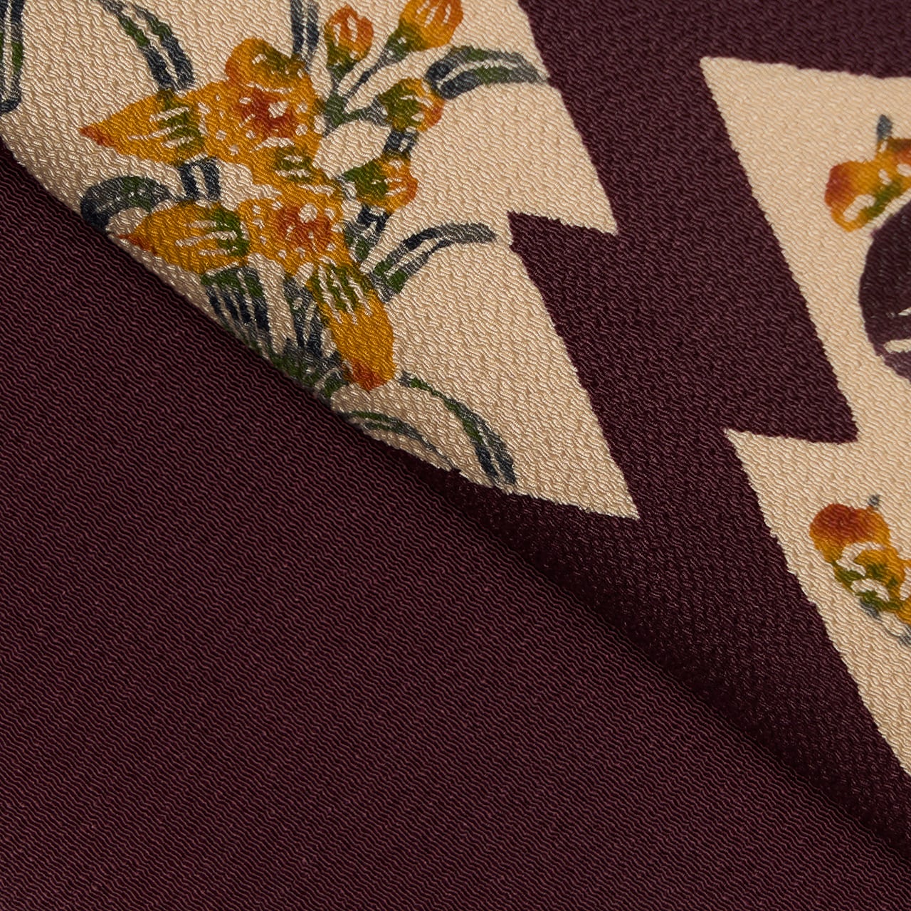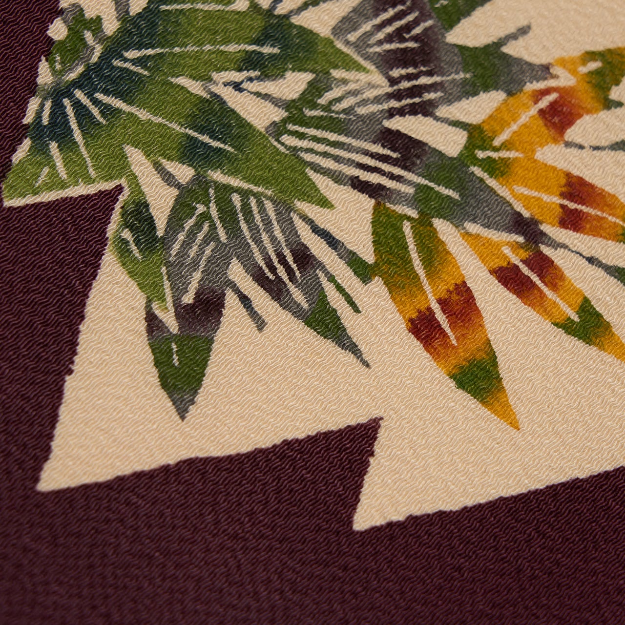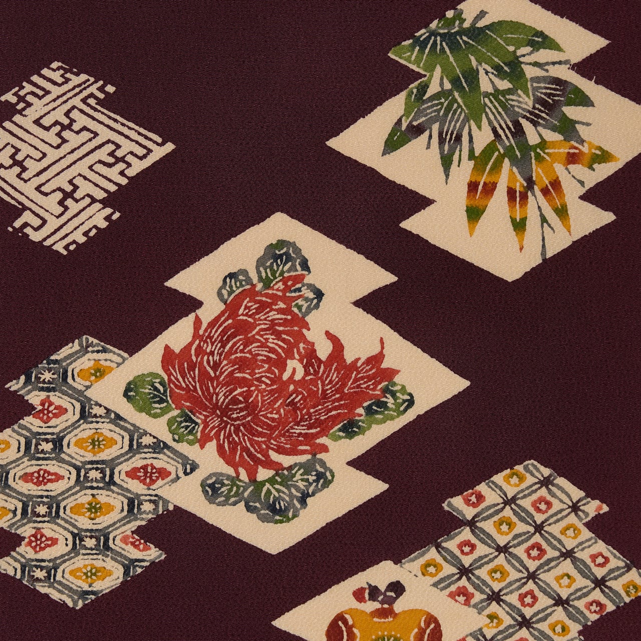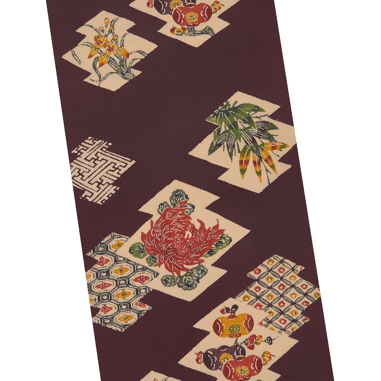 少しシボのあるぽってりとしたちりめん地が深い小豆色・似せ紫色に染められて、お太鼓から前柄を通して灰白色で松皮菱が染め抜かれ、その中に梅や春蘭、笹、菊などの草花と、紗綾型、七宝繋ぎ、亀甲模様などの幾何学模様が綺麗な色使いの型絵染で染められた、小島悳次郎さんの九寸名古屋帯の作品です。