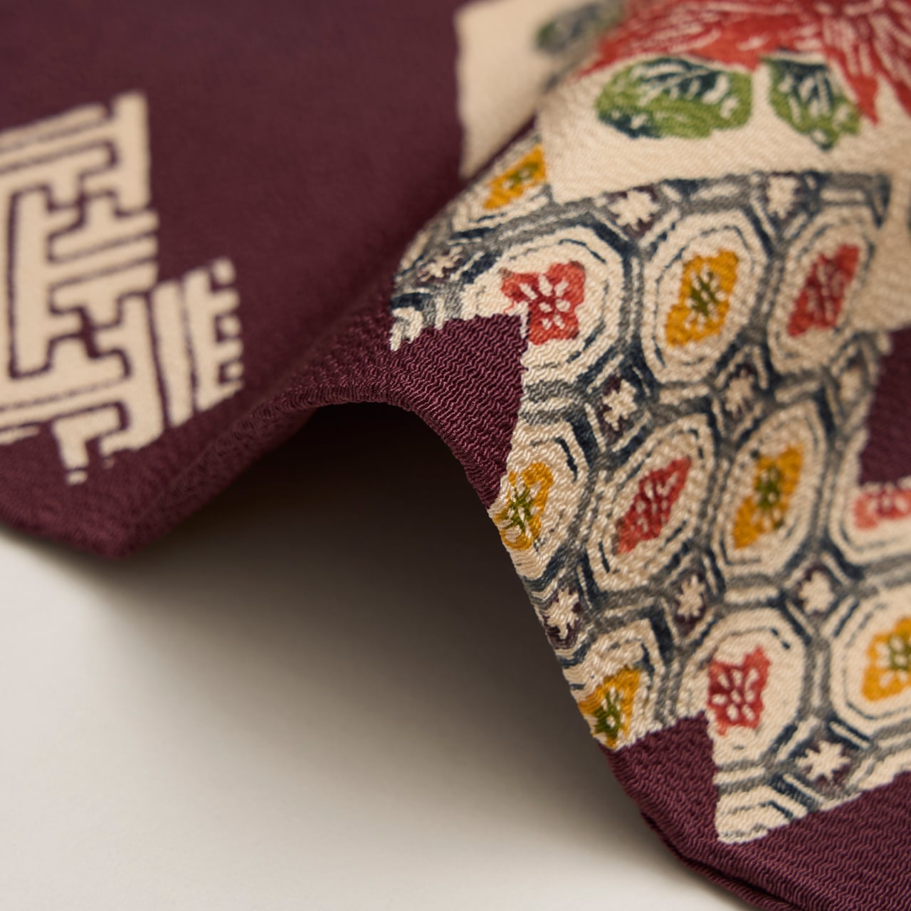 こちらは地色も志ま亀さん好みの深い小豆色となっていて、志ま亀さんのリクエストによるものと思われますが、梅のお花の独特でユニークな形や菊のお花の躍動感のある表現、そして部分的に幾何学模様を用いられているところなど、デザインセンスの高い小島さんの作品ならではの味わいが各所に楽しく見られます。