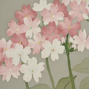 緑味のあるグレー・青白橡色の塩瀬の生地に、お太鼓には濡れ描きのような透明感のあるタッチで草の葉と茎が描かれ、それとは対照的にマットな質感の胡粉使いで、サクラソウのお花が綺麗な紫色系のピンク・浅蘇芳色と長春色の濃淡で手描きされた、可憐なお花がとてもチャーミングな素敵な名古屋帯です。