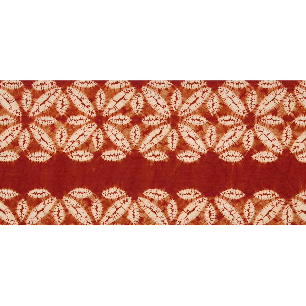 七宝繋ぎのような、お花のような模様が縦に3本並んで、その間に無地部分が取られ、茜染めの色の豊かさを実感できるような帯となっています。