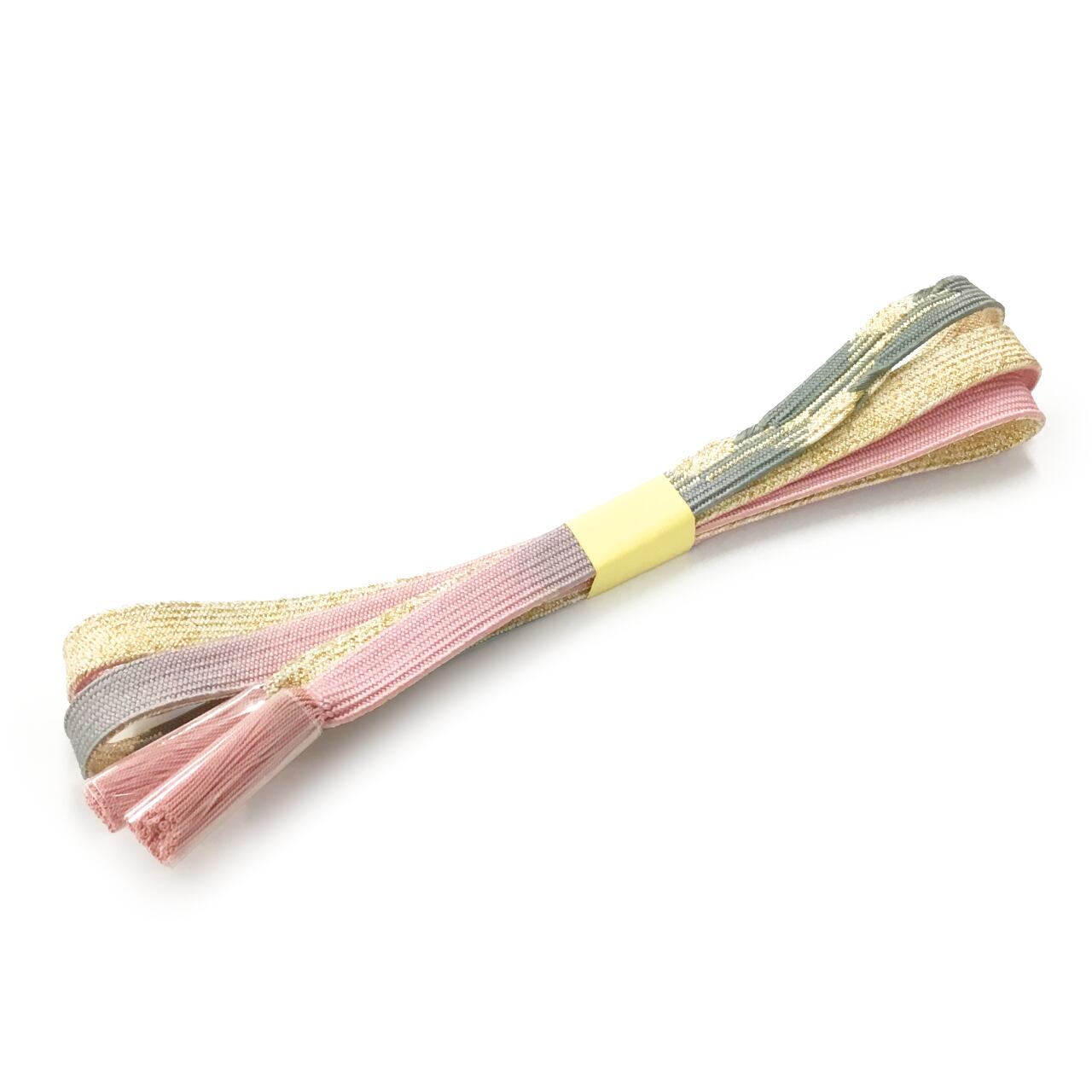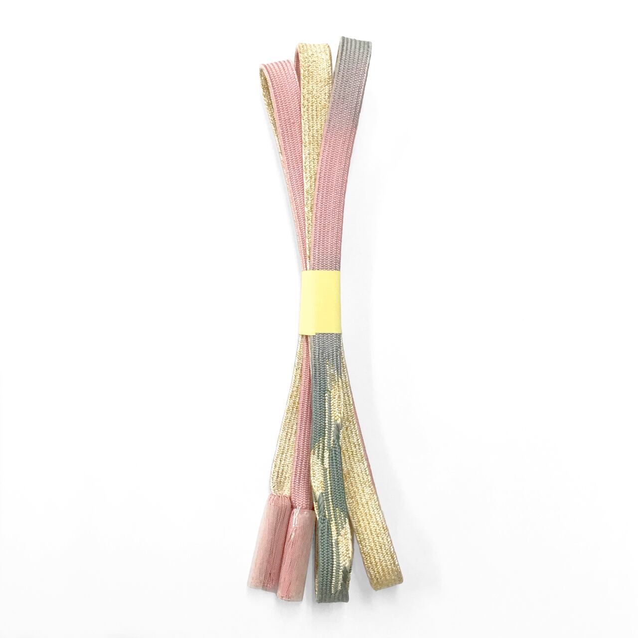 撫子色から湊鼠色へ美しい暈しで組まれ、湊鼠色の部分は変り組で金属糸と白糸が組まれています。