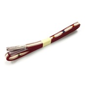 濃紅色地に象牙色で組まれた紐が縫い留められ、アクセントに櫨染色、紺色、蜜柑色、薄緑色、葡萄色の糸が巻かれているお洒落な一点です。