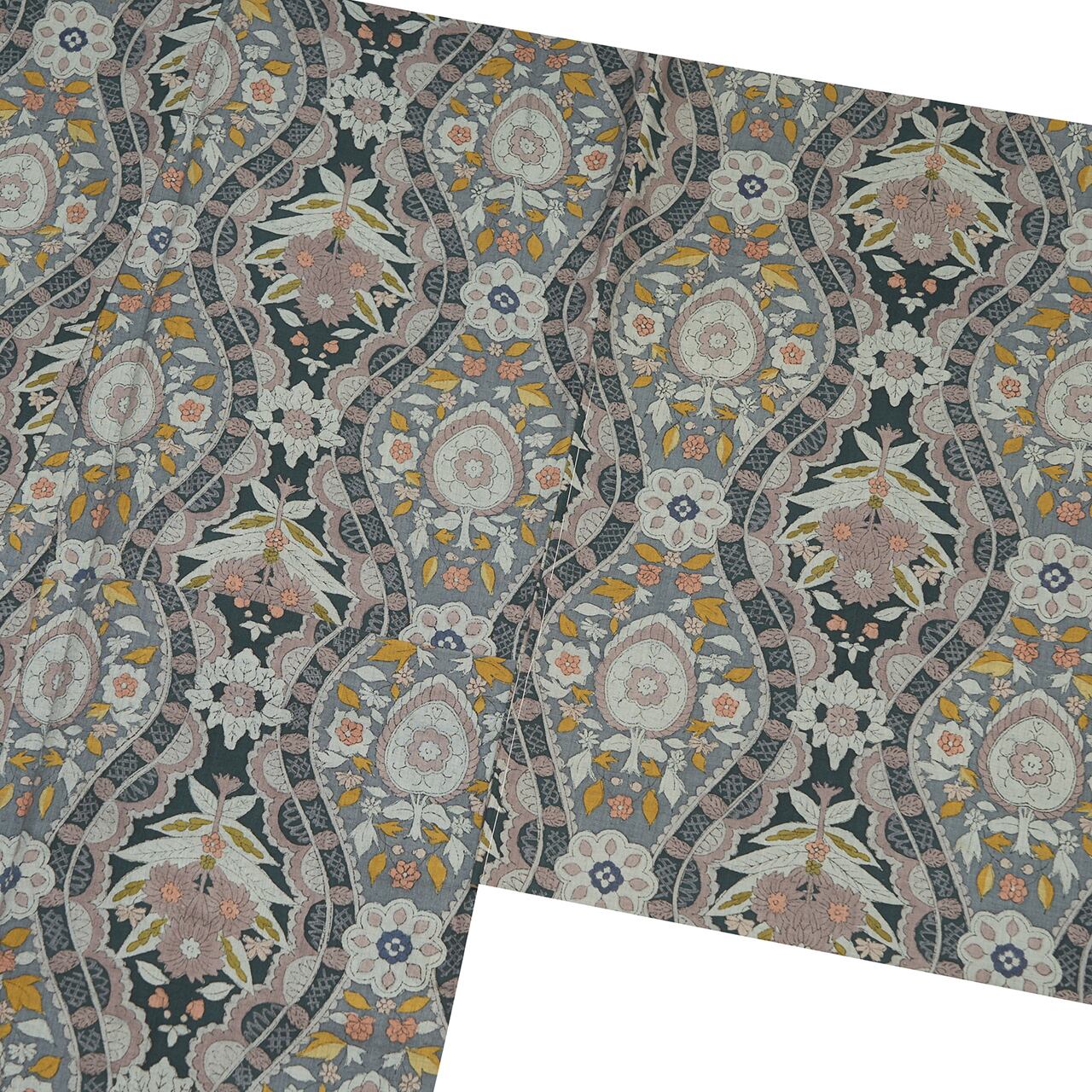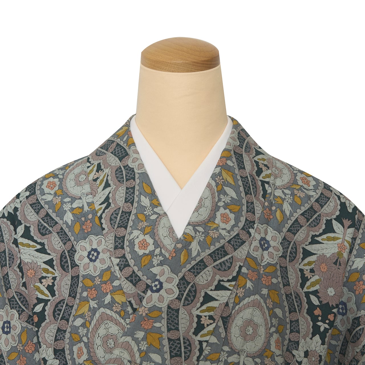 こういった更紗調のお着物は、柄の中の1色をとったり、八掛の色と合わせた帯揚げや帯締めを選ばれますと、綺麗にまとまったコーディネートをしていただけると思います。