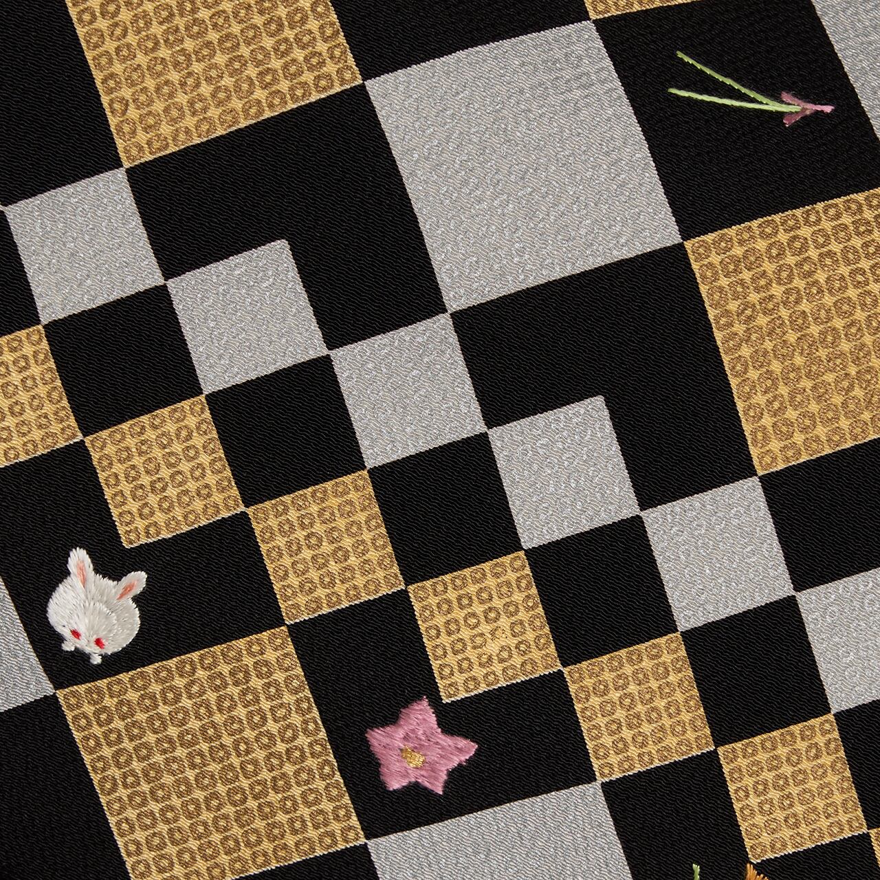少しシボのあるちりめんの生地が黒に染められ、お太鼓に大小の菱の形が取られて、その中が明るいグレー・銀鼠色と桑染色の濃淡で小さな疋田の模様で埋められ、間には小さな白いうさぎや桔梗、桜、紅葉などが手刺繍された、とてもはんなりとした風情のある、ホリヒロシさんのデザインの素敵な二部式の九寸名古屋帯です。