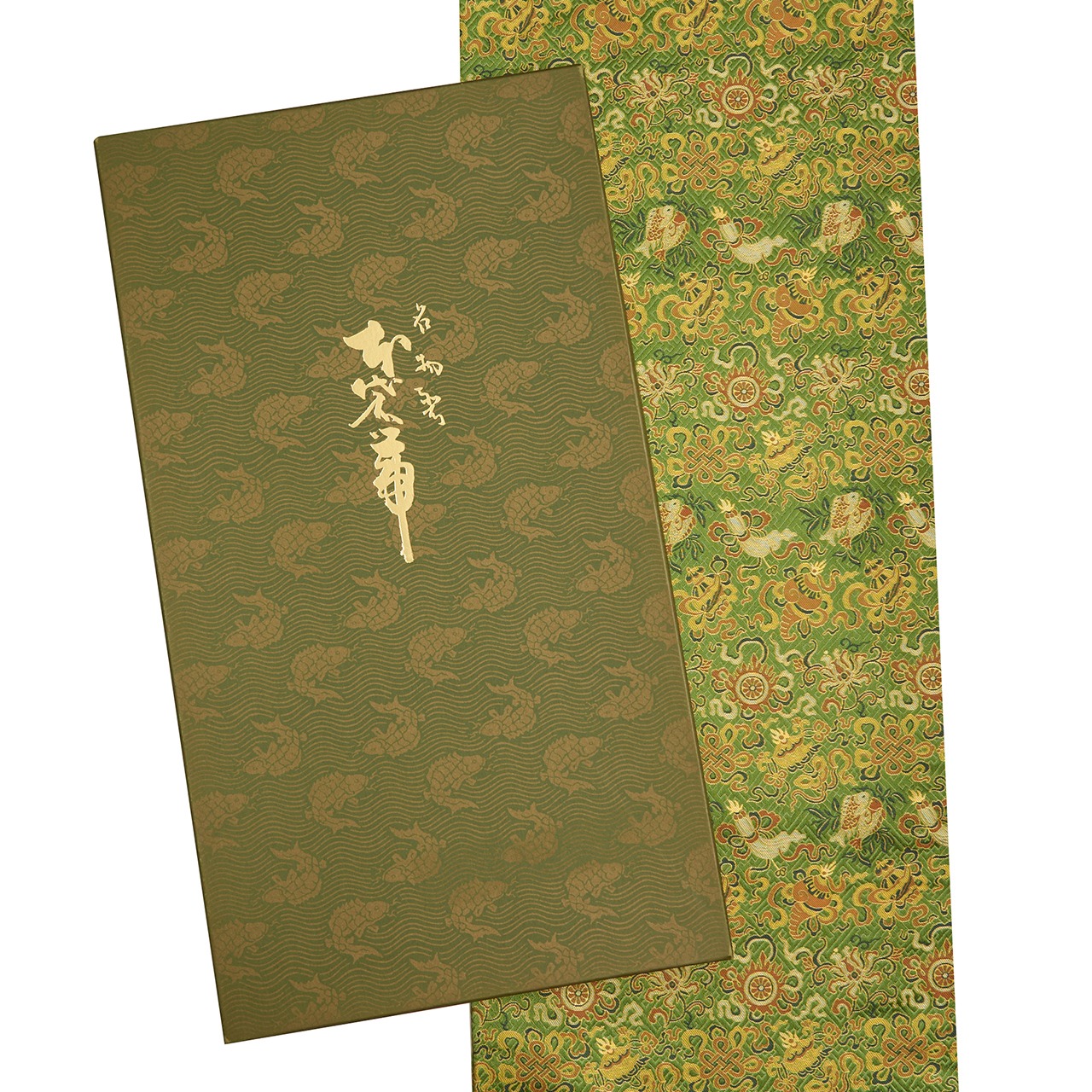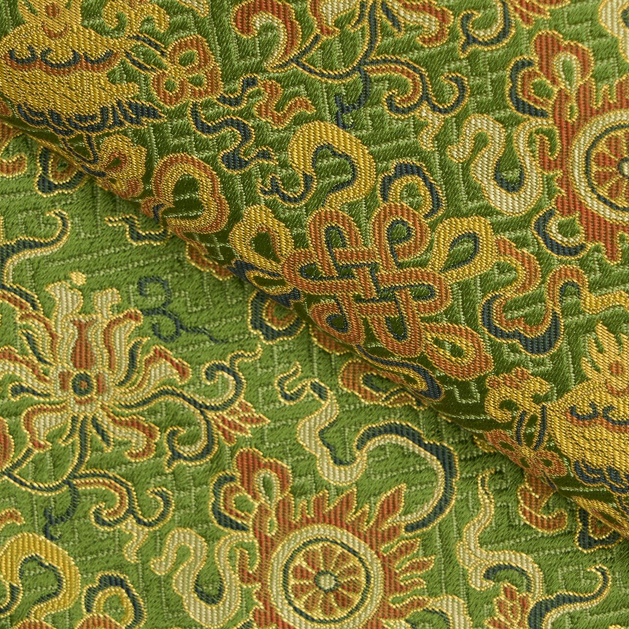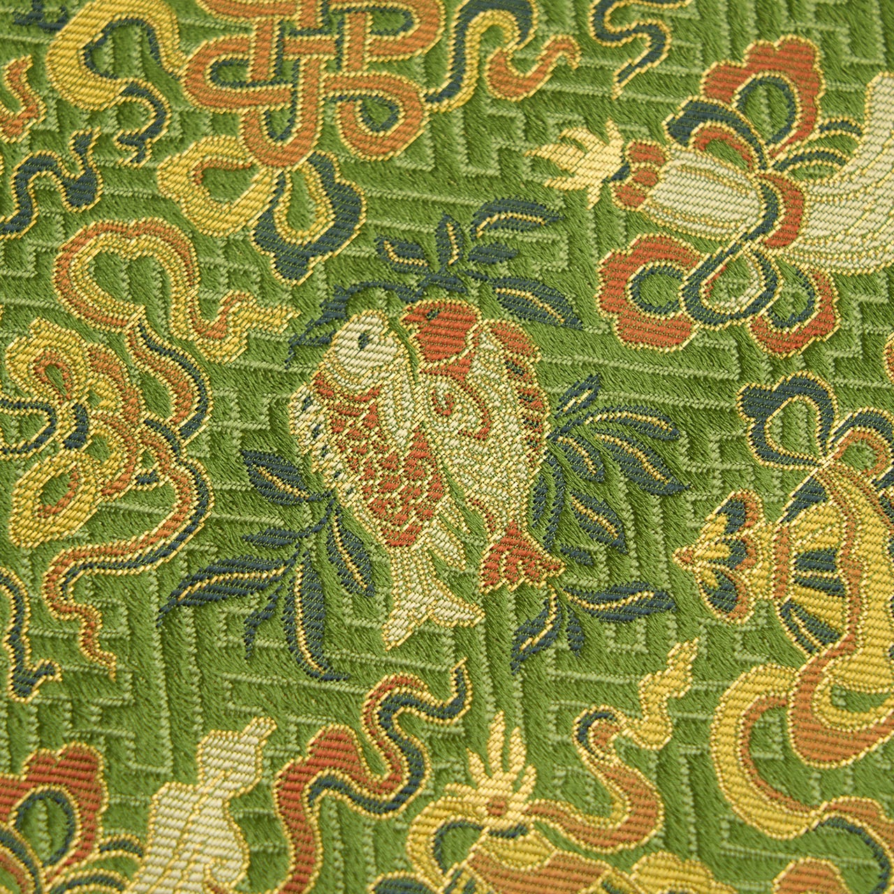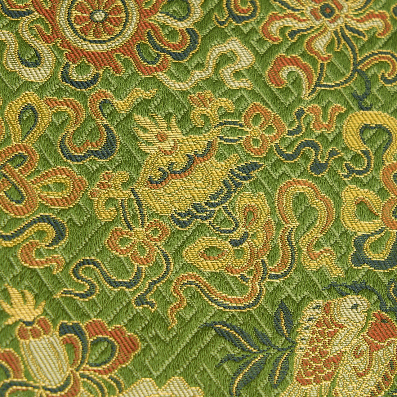 綺麗な緑色の地に、柿渋色の朱色を中心として織られた文様には、やはり古渡りの裂の雰囲気が醸し出され、どこか外国裂的なオリエンタルなテイストが感じられます。