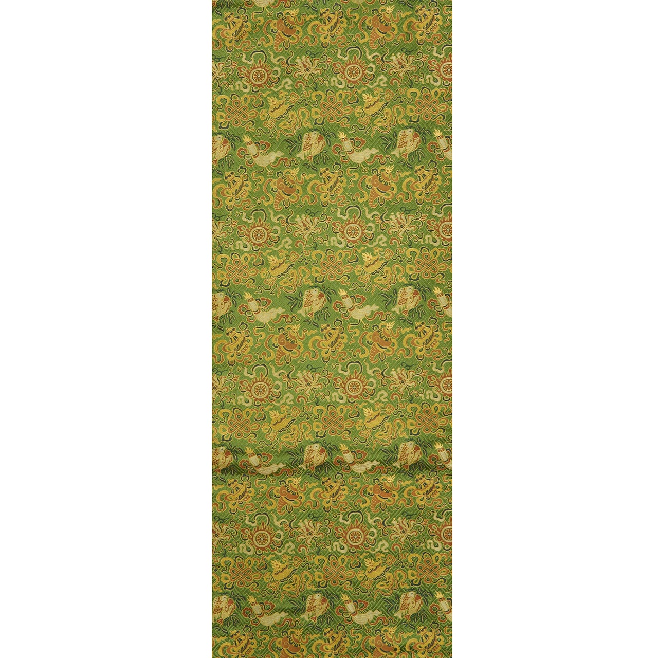 この文様は、中国の仏教の世界に「法螺貝」「法輪」「宝傘」「白覆面」「蓮」「宝瓶」「金魚」「板竜」という八宝と呼ばれるものがあり、それぞれにありがたい謂れや、仏様の救いに関する事柄などがあるようですが、その思想に由来した模様で、それに吉祥文様を組み合わせて織られたもののようです。