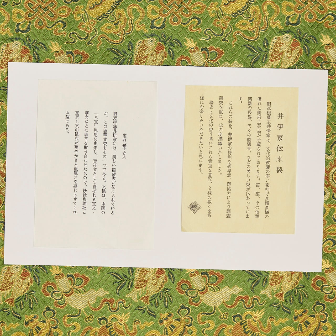 旧彦根藩主・井伊家には、数々の文化遺産的な美術工芸品が所蔵されていて、染織品に関しても古渡りの錦の裂や更紗など、貴重なものがたくさん見られます。