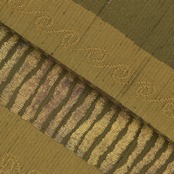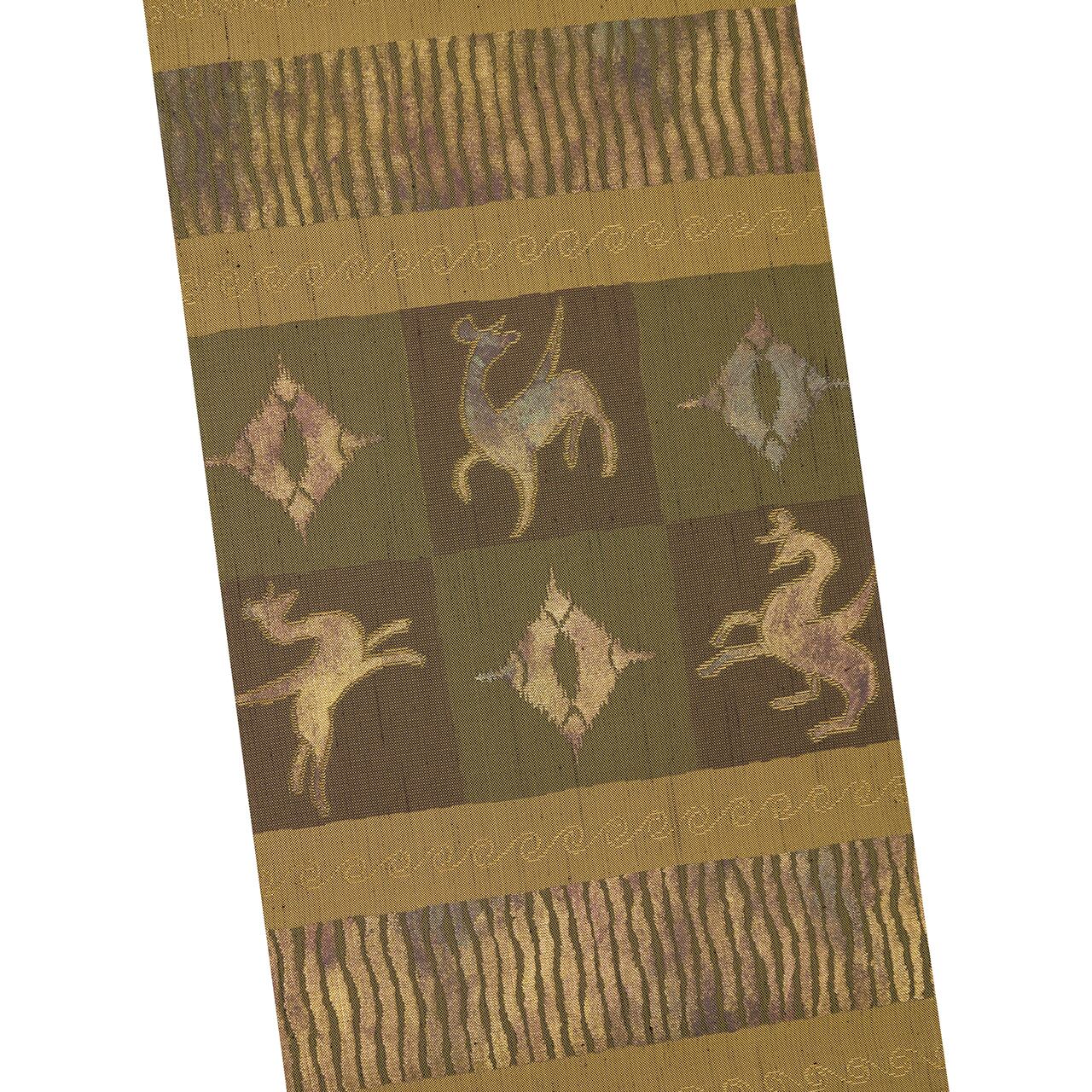 少しだけ緑味のあるベージュ・桑染色の紬地に太く細く段が取られ、細い方にはランダムなよろけ縞のような模様が、太い方には岩井茶色の緑と海松茶色の焦げ茶で市松がとられた中に、鹿のような動物と菱の形が織られています。