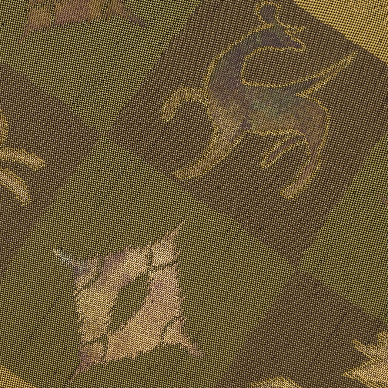 その模様は非常に細い焼き箔のような金糸で織られていて、とてもしなやかな手触りで、古い青銅の器を彷彿するような古色然とした素敵な佇まいとなった、勝山織物さんの袋帯です。