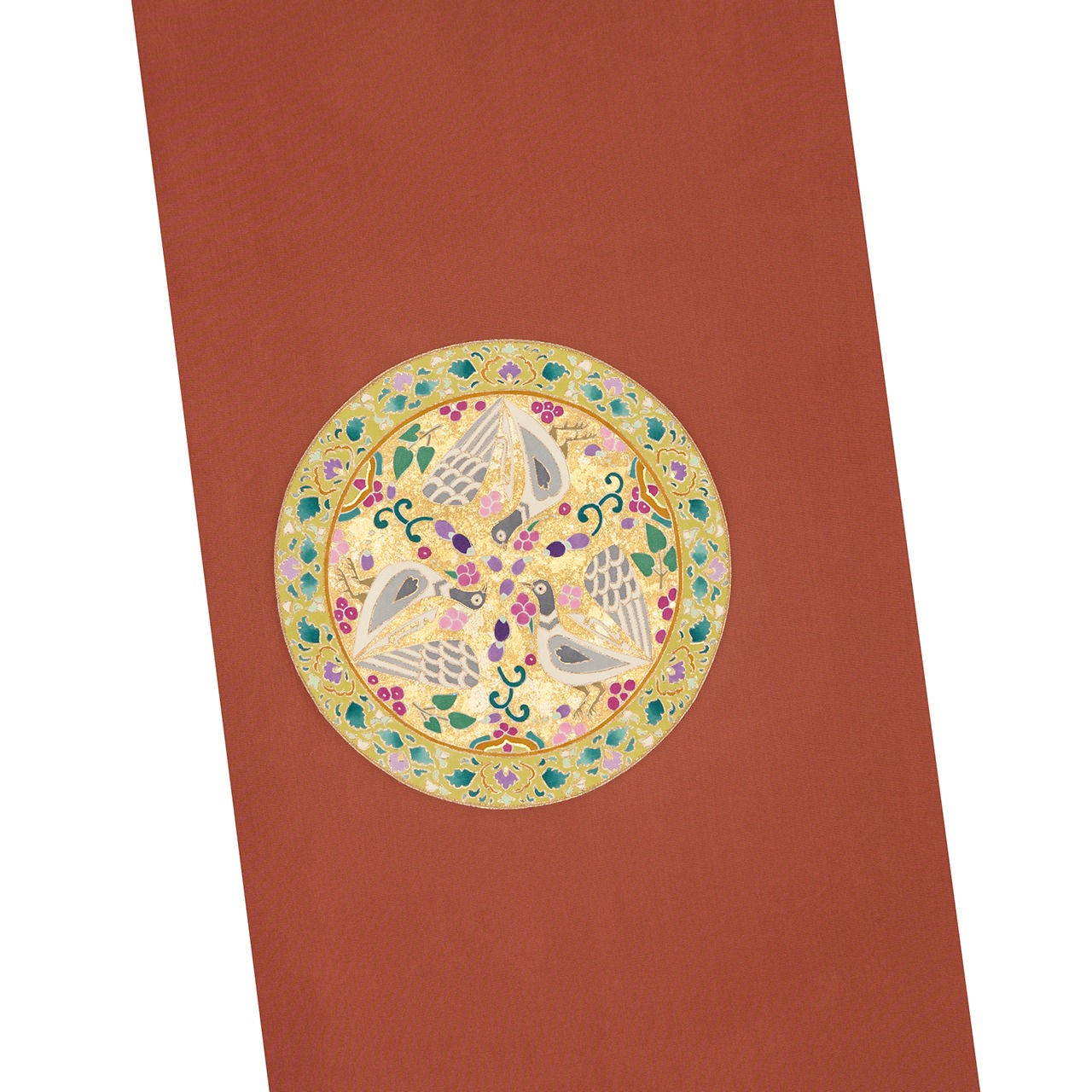 赤味のある茶・紅鳶色のしなやかな塩瀬の生地に、お太鼓のやや左寄りに大きな丸が取られ、その縁には若菜色の地にリボンのように草花の絵が描かれ、中は金の箔で埋められて、3羽の鳥と可愛いお花や木の実のようなものが描かれた、素敵な友禅染の九寸名古屋帯です。