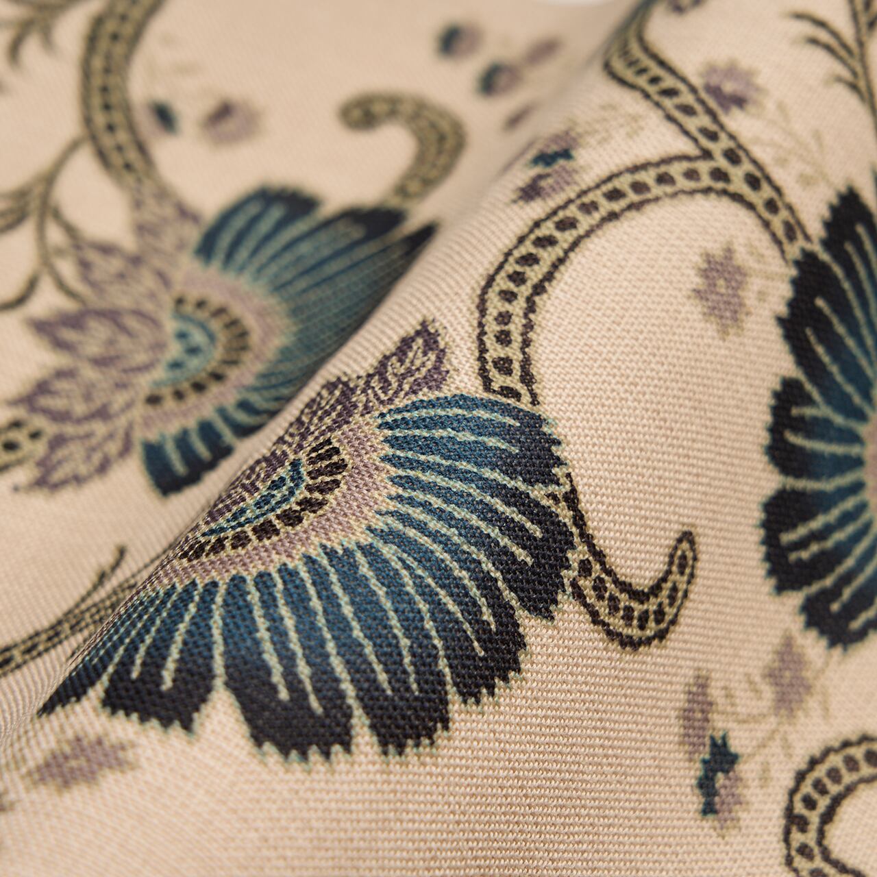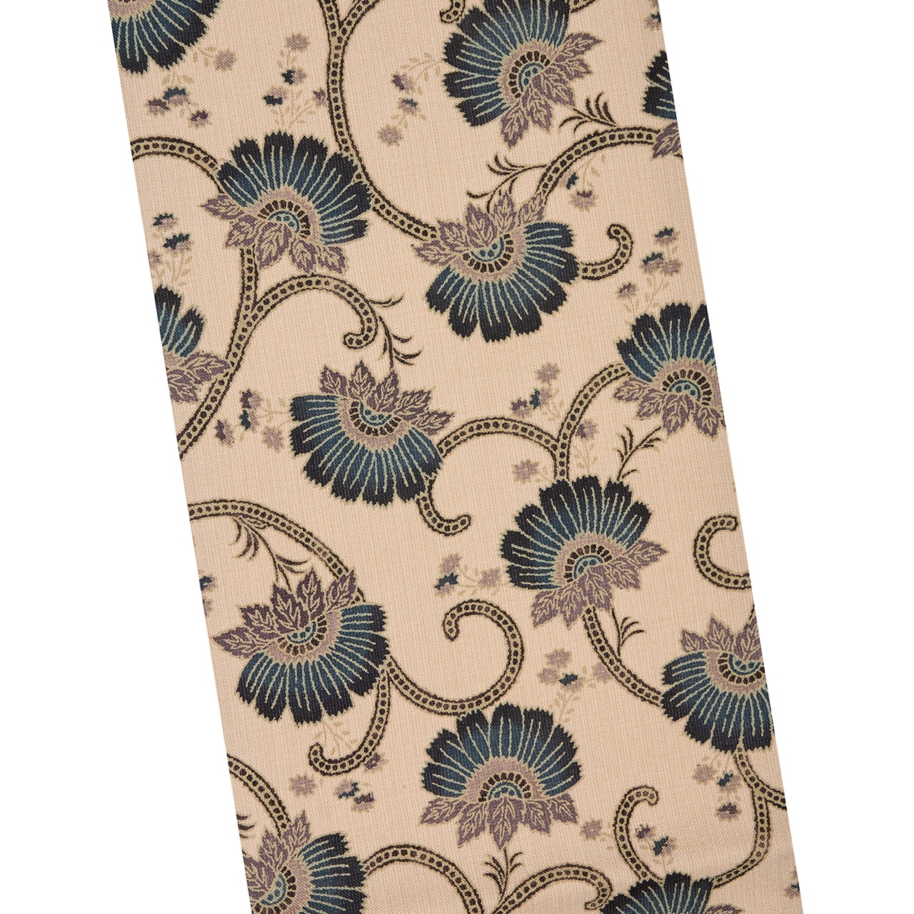 ほんの少しだけピンク味のある淡いベージュに、藍色のお花がすっきりと描かれていて、そのコントラストも爽やかですが、その2色の間を取り持つような少しずつ違うグレーの色も絶妙に配置されていて、本当に綺麗で目を引くような模様が繰り広げられています。