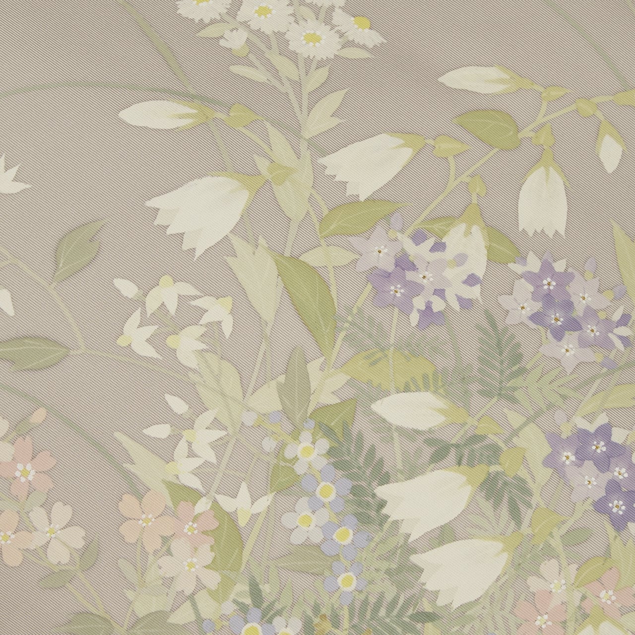 少し甘さのある綺麗なグレー・潤色の塩瀬の生地に、ホタルブクロやユキノシタ、野菊、竜胆、カタバミ、海老根蘭などのいろいろなお花が、山里に咲いているような夢のような情景が手描きの友禅で表された、お洒落な九寸名古屋帯です。