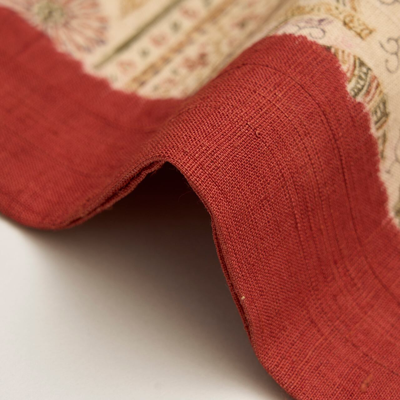 横に節のある座繰りのシャリ感のある紬地が、薄いベージュ・練色に染められ、左端が蘇芳色の赤に絞りで染め分けられて、練色の方にはいろいろな幅の段が取られ、花を咥えた孔雀や花唐草、ペルシャ花文、紋章のような様々な模様が、木版の更紗染めのようなタッチで描かれた、オリエンタルな雰囲気のあるお洒落な九寸名古屋帯です。
